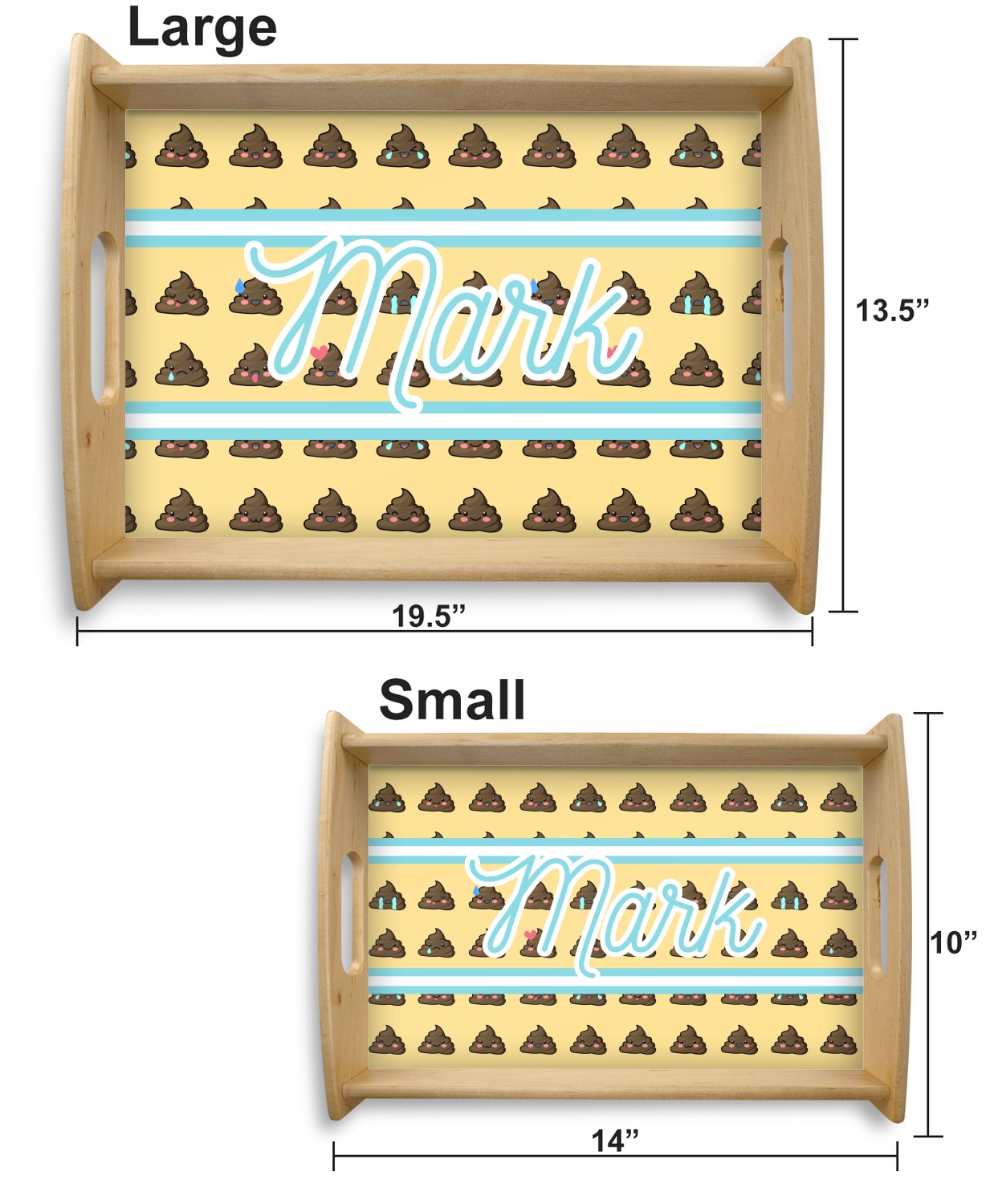 This serving tray with handles features square edges and two rounded sides, creating a very modern look. Each side is fabricated from a beautifully cut, natural wood. The bottom of the interior of the tray displays your customized design in bright, vibrant color. The tray is sold in both a black color and a natural wood look. Each variation of the wood serving tray has two sizes: Small, which is 14" x 10" x 2.25", and Large, which is 19.5" x 13.5" x 2.75".