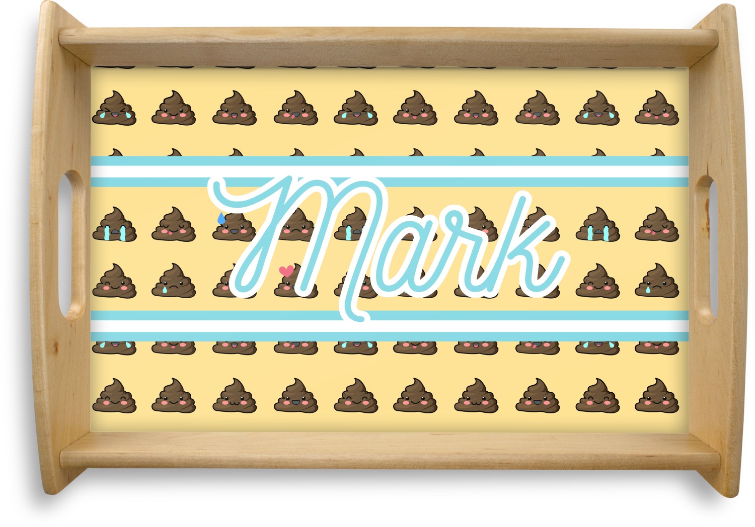 The design is a fun bright yellow with brown poop emojis all over. Each emoji is making a different face! Two light teal / turquoise ribbons are use to frame your personalization in the middle of the design. The coordinating design has a fun speckled yellow background with a large poop emoji right in the middle, saying "Oh, Poo!" underneath.