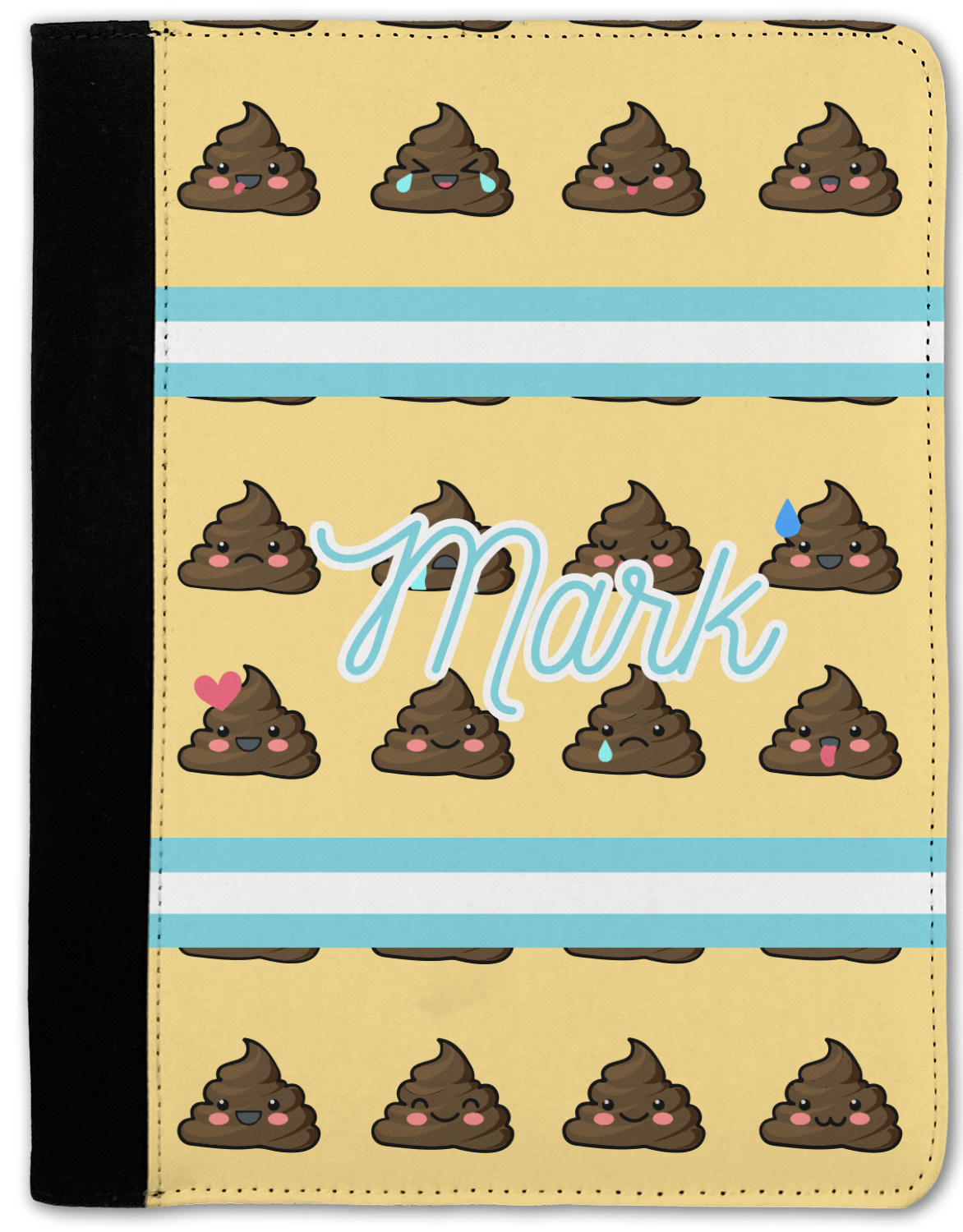 The design is a fun bright yellow with brown poop emojis all over. Each emoji is making a different face! Two light teal / turquoise ribbons are use to frame your personalization in the middle of the design. The coordinating design has a fun speckled yellow background with a large poop emoji right in the middle, saying "Oh, Poo!" underneath.