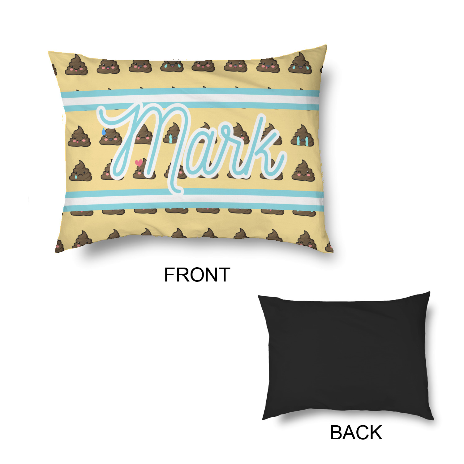 The design is a fun bright yellow with brown poop emojis all over. Each emoji is making a different face! Two light teal / turquoise ribbons are use to frame your personalization in the middle of the design. The coordinating design has a fun speckled yellow background with a large poop emoji right in the middle, saying "Oh, Poo!" underneath.