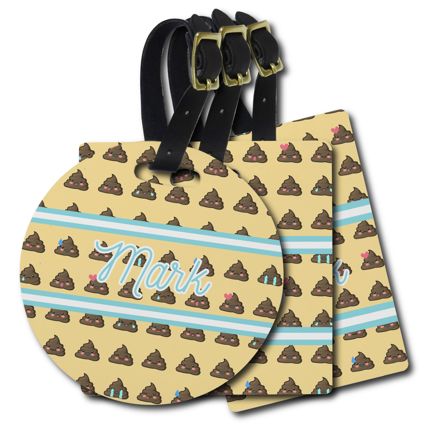 These personalized bag tags are sold in a variety of shapes, so that you may find the product that meets your vision exactly. We sell a round luggage tag, which measures at approximately 4" x 4". Our square luggage tag is about 3.5" x 3.5", while our rectangular version is 2.75" x 4 ".