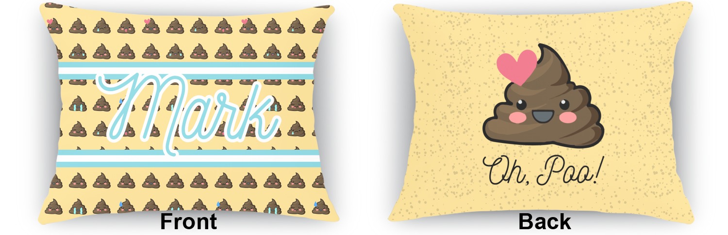 The design is a fun bright yellow with brown poop emojis all over. Each emoji is making a different face! Two light teal / turquoise ribbons are use to frame your personalization in the middle of the design. The coordinating design has a fun speckled yellow background with a large poop emoji right in the middle, saying "Oh, Poo!" underneath.