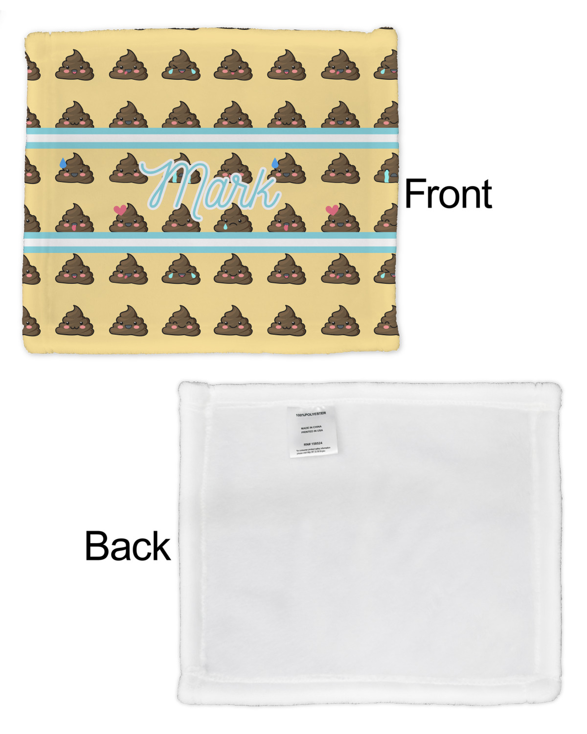 The design is a fun bright yellow with brown poop emojis all over. Each emoji is making a different face! Two light teal / turquoise ribbons are use to frame your personalization in the middle of the design. The coordinating design has a fun speckled yellow background with a large poop emoji right in the middle, saying "Oh, Poo!" underneath.