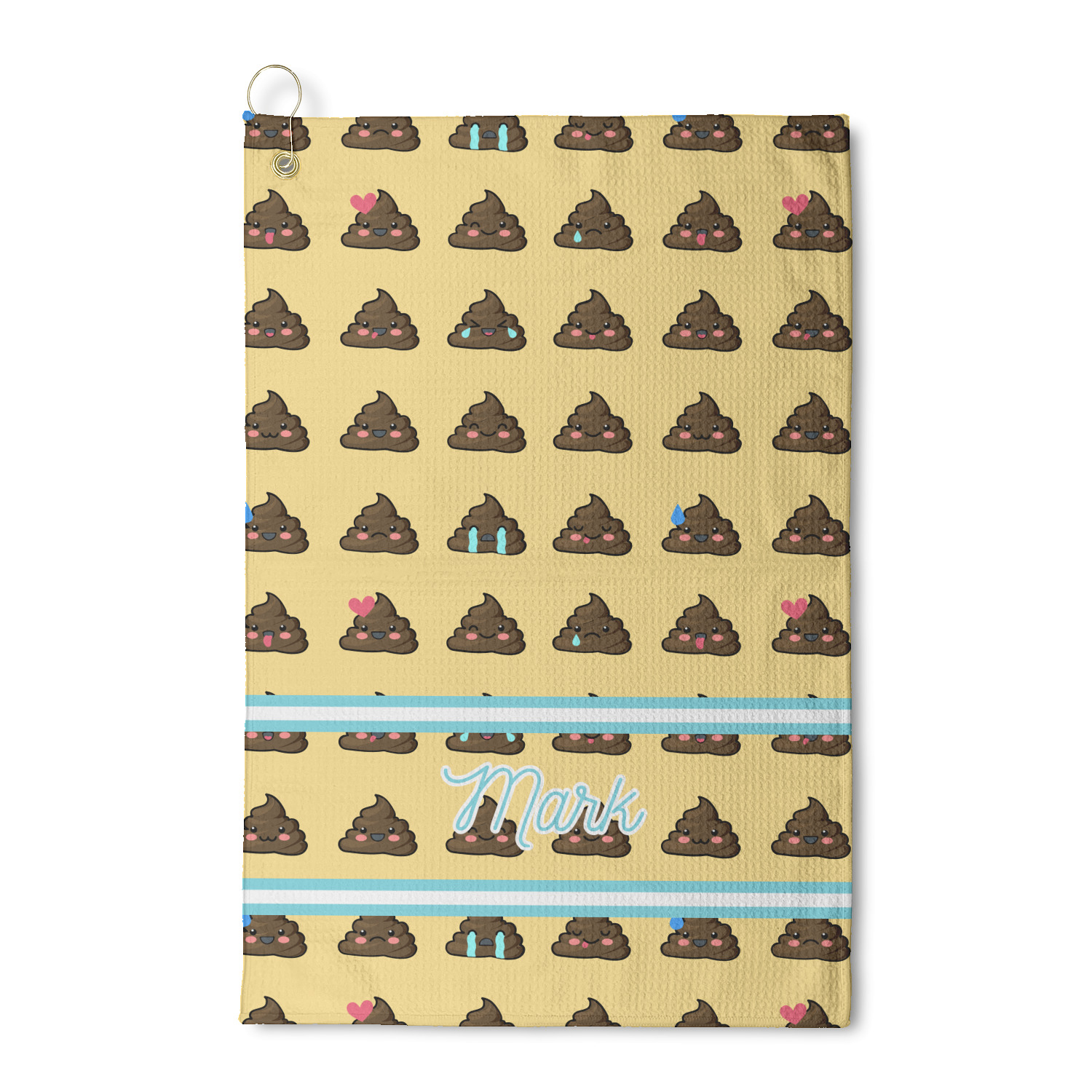 The design is a fun bright yellow with brown poop emojis all over. Each emoji is making a different face! Two light teal / turquoise ribbons are use to frame your personalization in the middle of the design. The coordinating design has a fun speckled yellow background with a large poop emoji right in the middle, saying "Oh, Poo!" underneath.