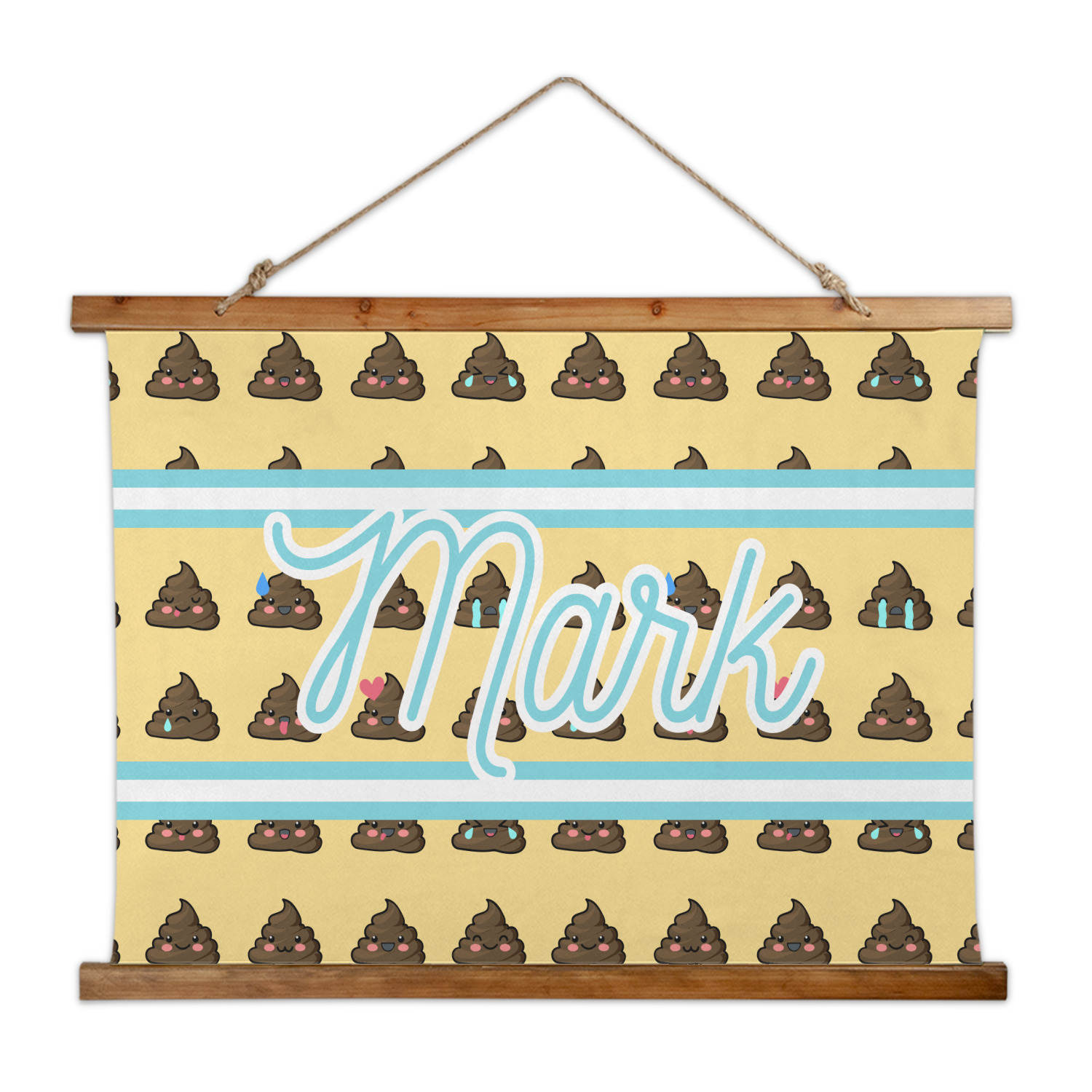 The design is a fun bright yellow with brown poop emojis all over. Each emoji is making a different face! Two light teal / turquoise ribbons are use to frame your personalization in the middle of the design. The coordinating design has a fun speckled yellow background with a large poop emoji right in the middle, saying "Oh, Poo!" underneath.