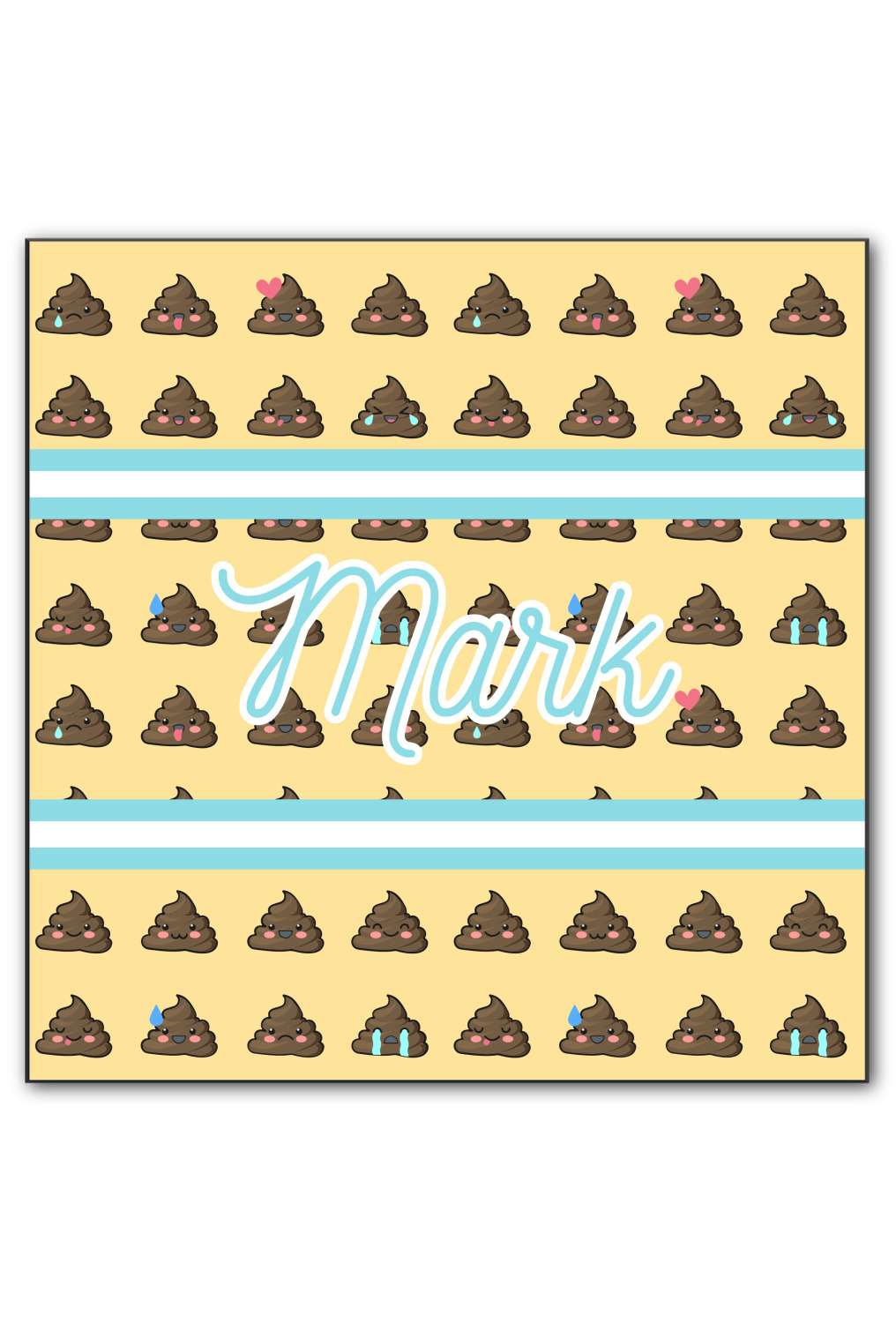 The design is a fun bright yellow with brown poop emojis all over. Each emoji is making a different face! Two light teal / turquoise ribbons are use to frame your personalization in the middle of the design. The coordinating design has a fun speckled yellow background with a large poop emoji right in the middle, saying "Oh, Poo!" underneath.