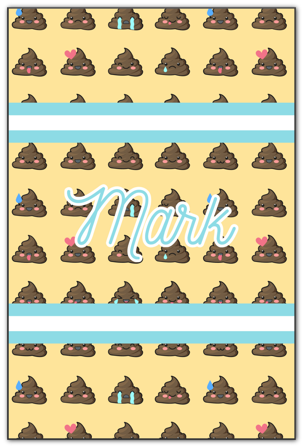 The design is a fun bright yellow with brown poop emojis all over. Each emoji is making a different face! Two light teal / turquoise ribbons are use to frame your personalization in the middle of the design. The coordinating design has a fun speckled yellow background with a large poop emoji right in the middle, saying "Oh, Poo!" underneath.