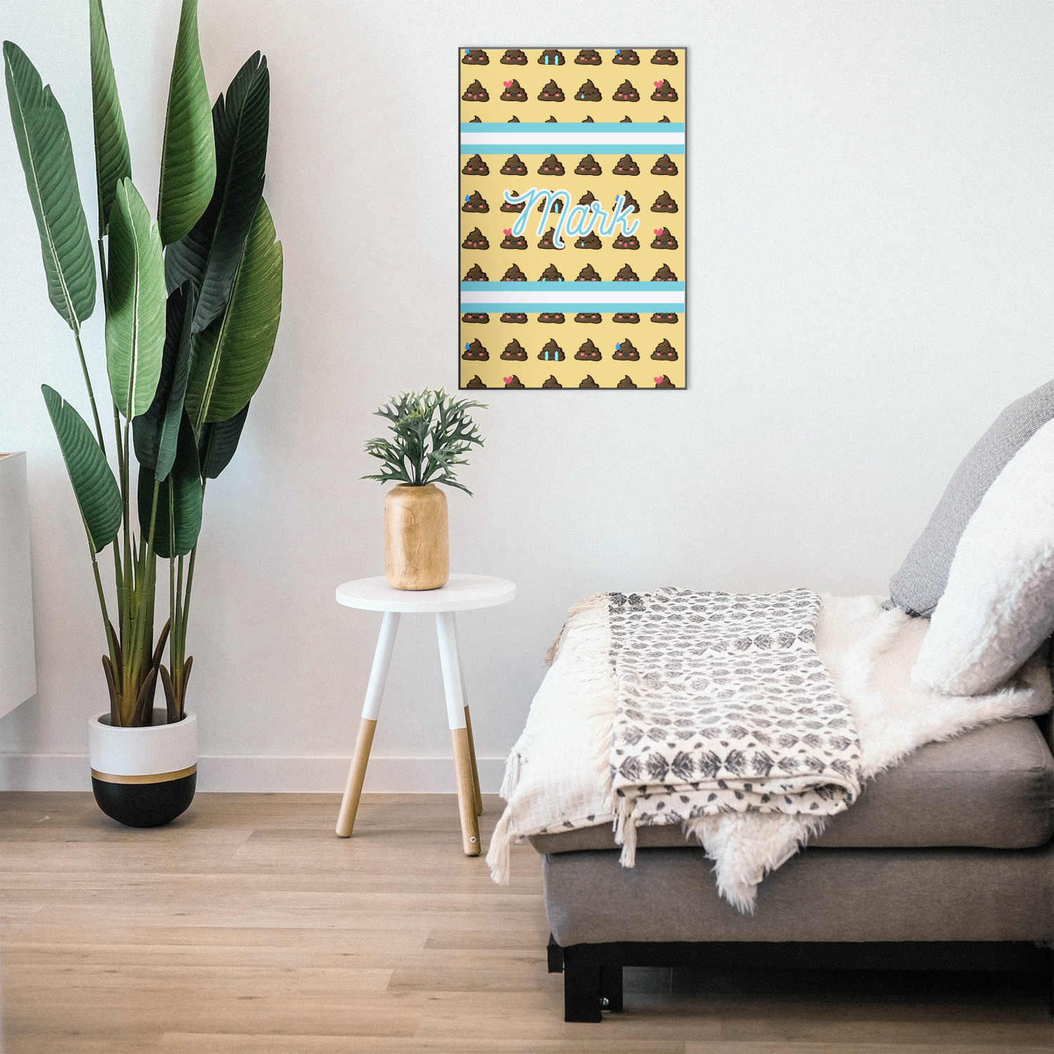 The design is a fun bright yellow with brown poop emojis all over. Each emoji is making a different face! Two light teal / turquoise ribbons are use to frame your personalization in the middle of the design. The coordinating design has a fun speckled yellow background with a large poop emoji right in the middle, saying "Oh, Poo!" underneath.