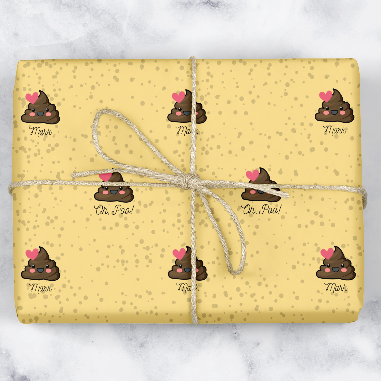 The design is a fun bright yellow with brown poop emojis all over. Each emoji is making a different face! Two light teal / turquoise ribbons are use to frame your personalization in the middle of the design. The coordinating design has a fun speckled yellow background with a large poop emoji right in the middle, saying "Oh, Poo!" underneath.