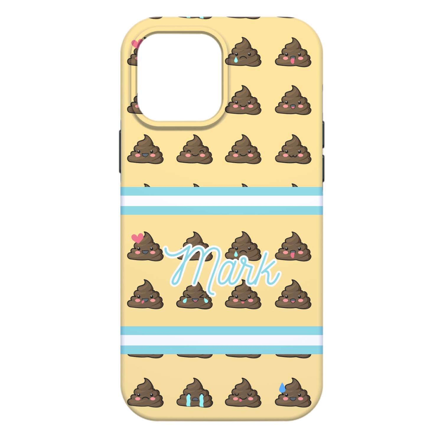 The design is a fun bright yellow with brown poop emojis all over. Each emoji is making a different face! Two light teal / turquoise ribbons are use to frame your personalization in the middle of the design. The coordinating design has a fun speckled yellow background with a large poop emoji right in the middle, saying "Oh, Poo!" underneath.