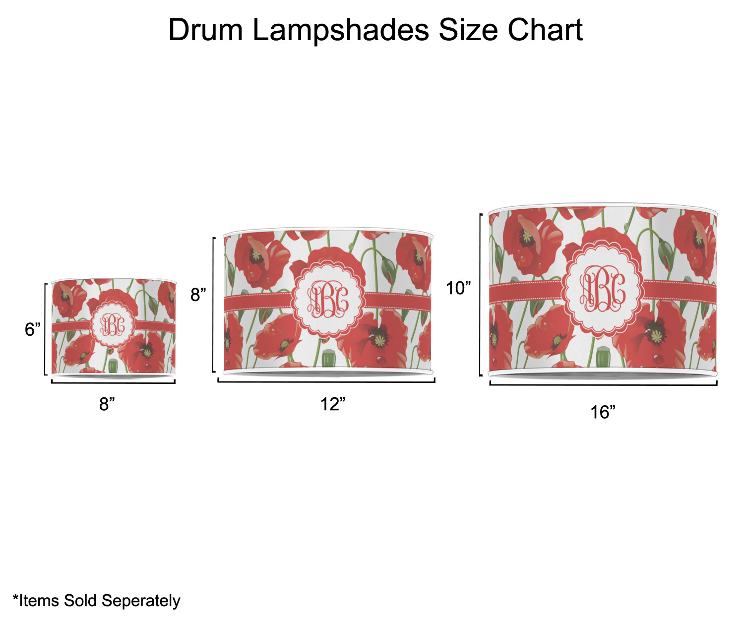Our customized lamp shades also come in 3 different sizes: 8", 12" and 16", measuring at 8" in diameter by 6" tall, 12" in diameter by 8" tall, and 16" in diameter by 10" tall, respectively.