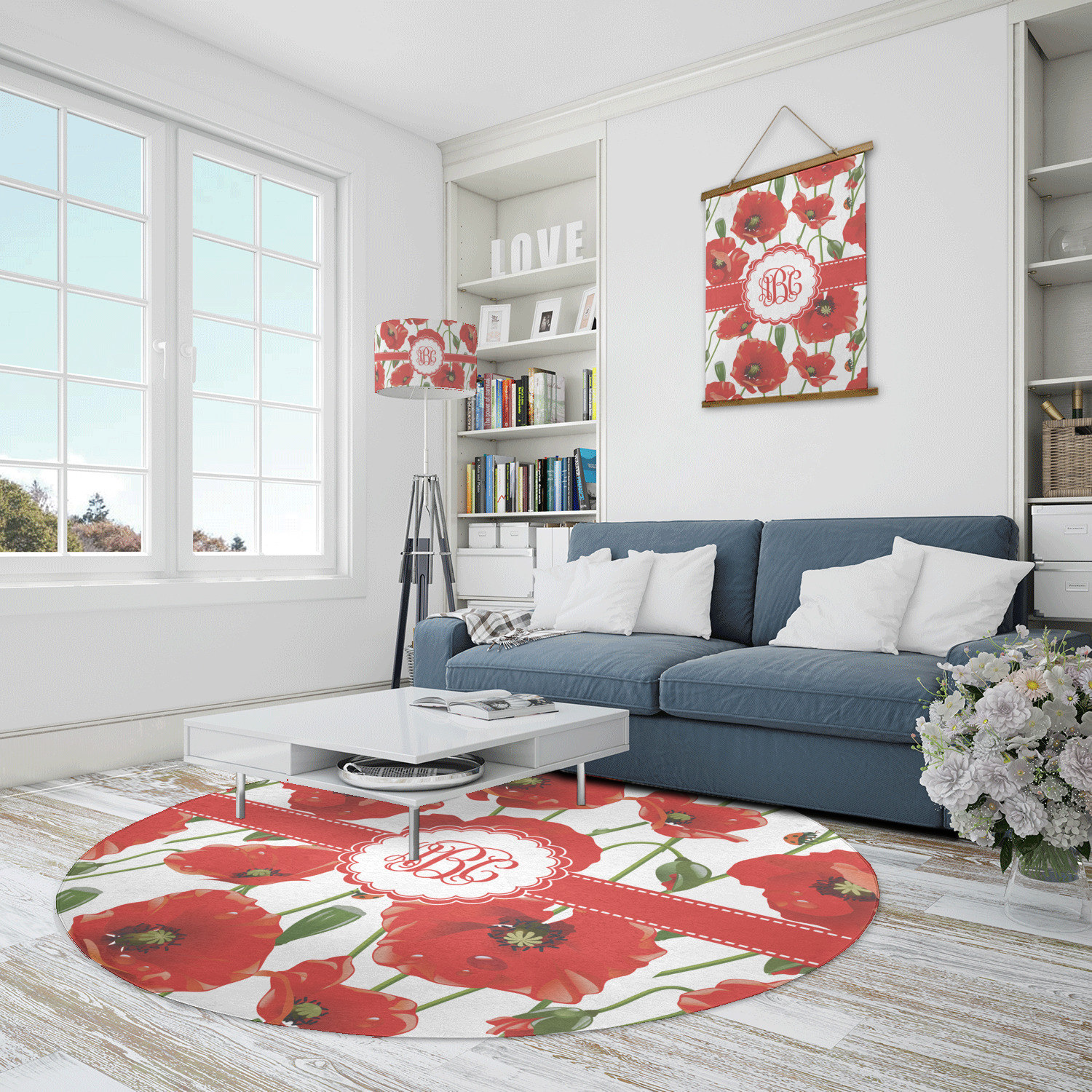 A scalloped label rests in the center of the poppy field, the perfect place for the personalization of your choice.