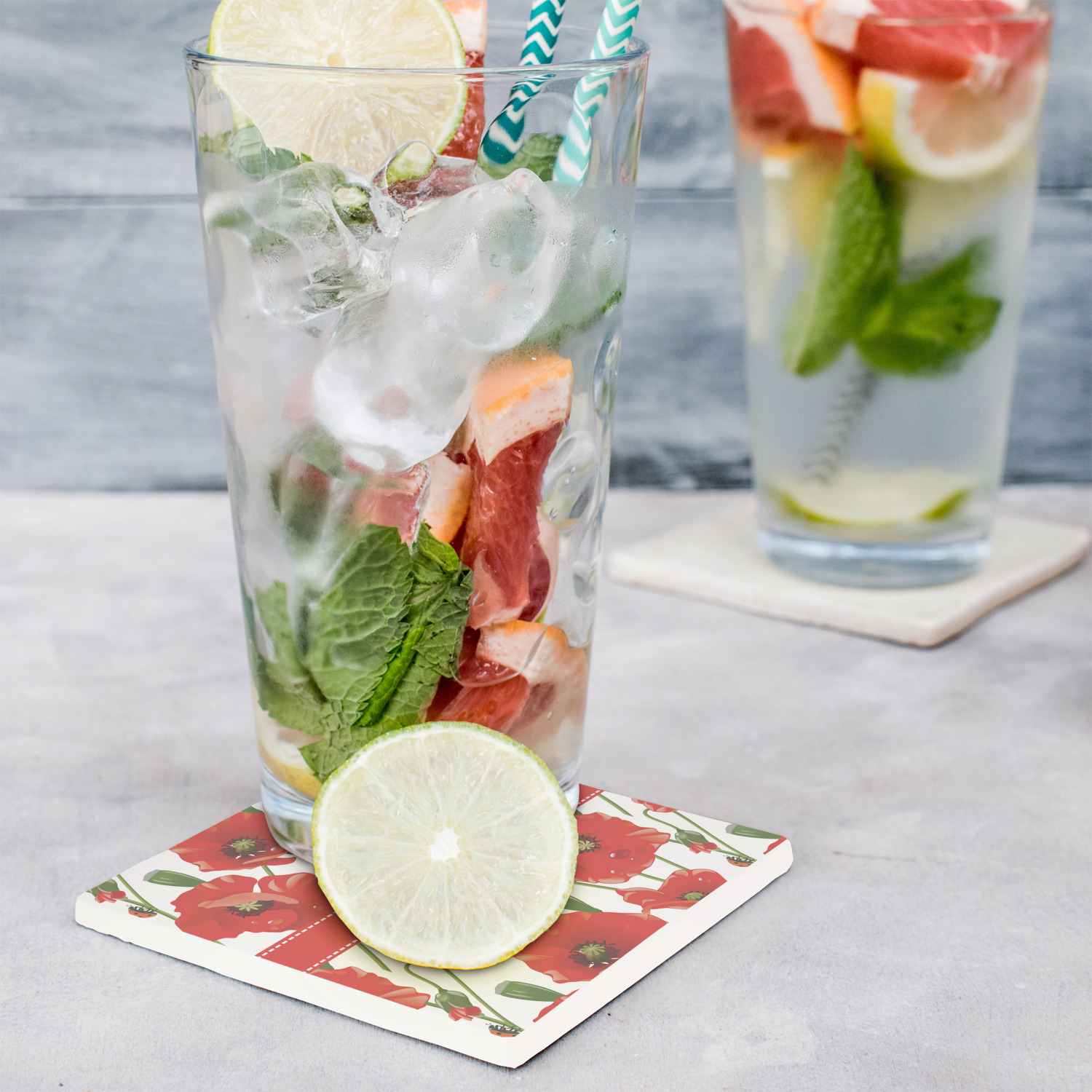 Our super absorbent stone coasters absorb the condensation into the coaster, before it has a chance to flow on to your furniture or table tops, thus preventing watermarks and blemishes.