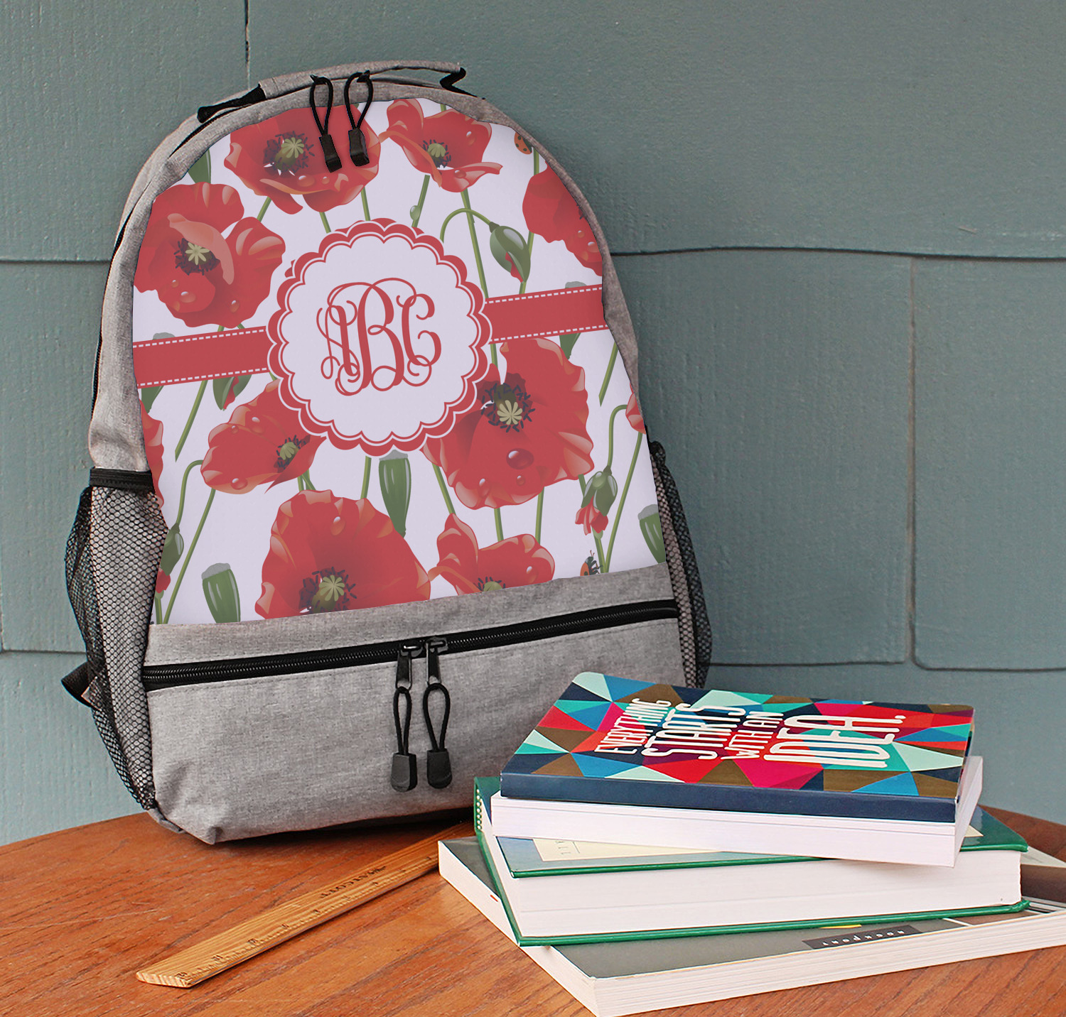 A scalloped label rests in the center of the poppy field, the perfect place for the personalization of your choice.