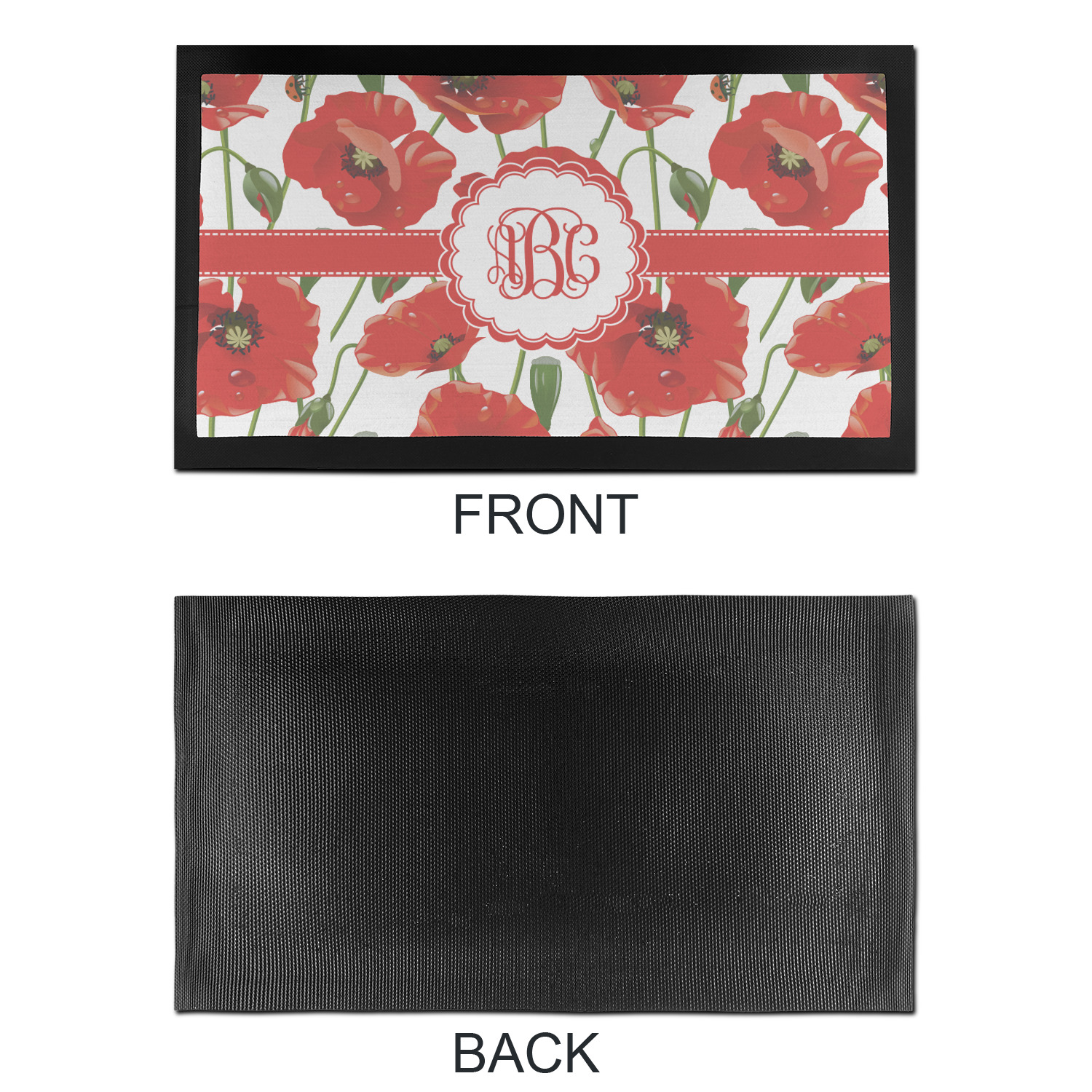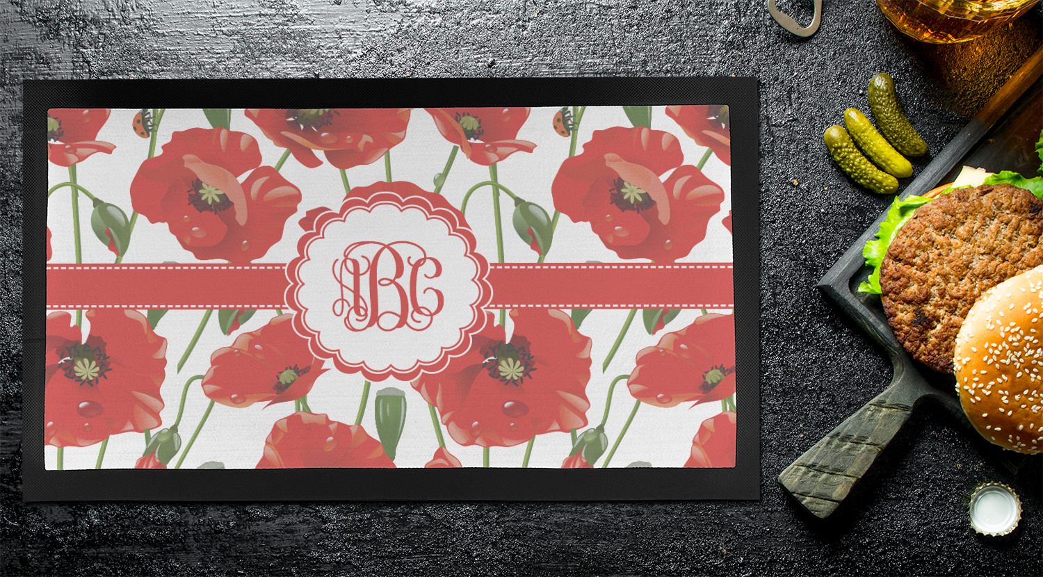 A scalloped label rests in the center of the poppy field, the perfect place for the personalization of your choice.