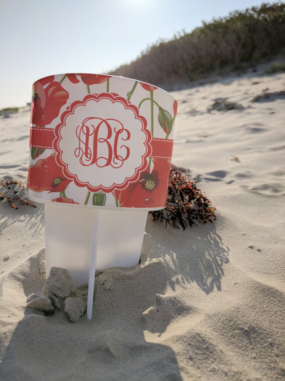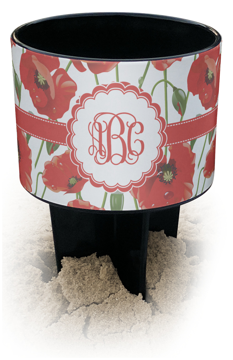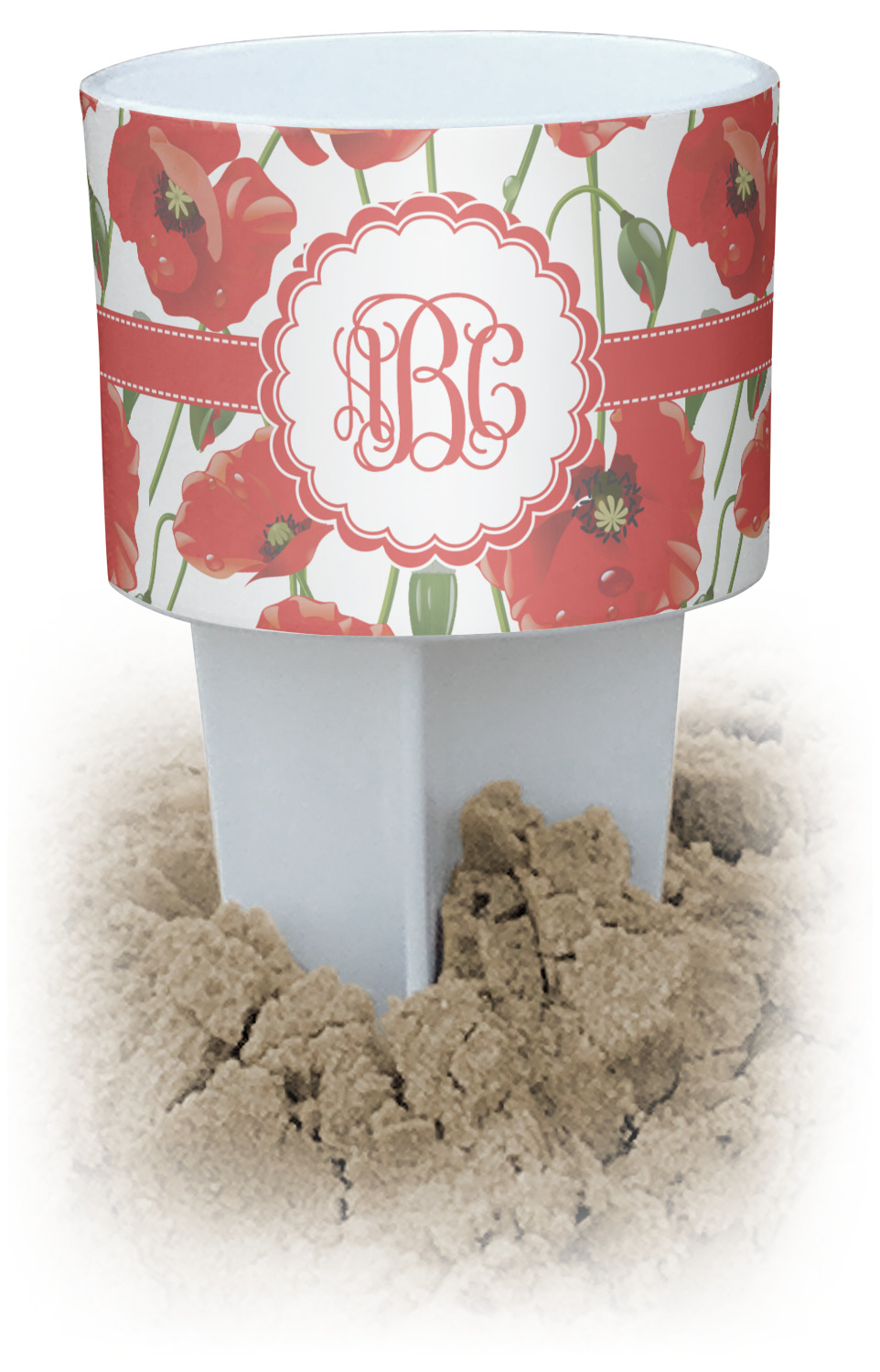 This cup holder has a large stake at its bottom that anchors it to the sand or ground below, while the cup holder rests above the stake. The entire drink holder is made of durable plastic and displays your customization around the cup holder portion. We sell these personalized beach spikers in two different colors: black and white.