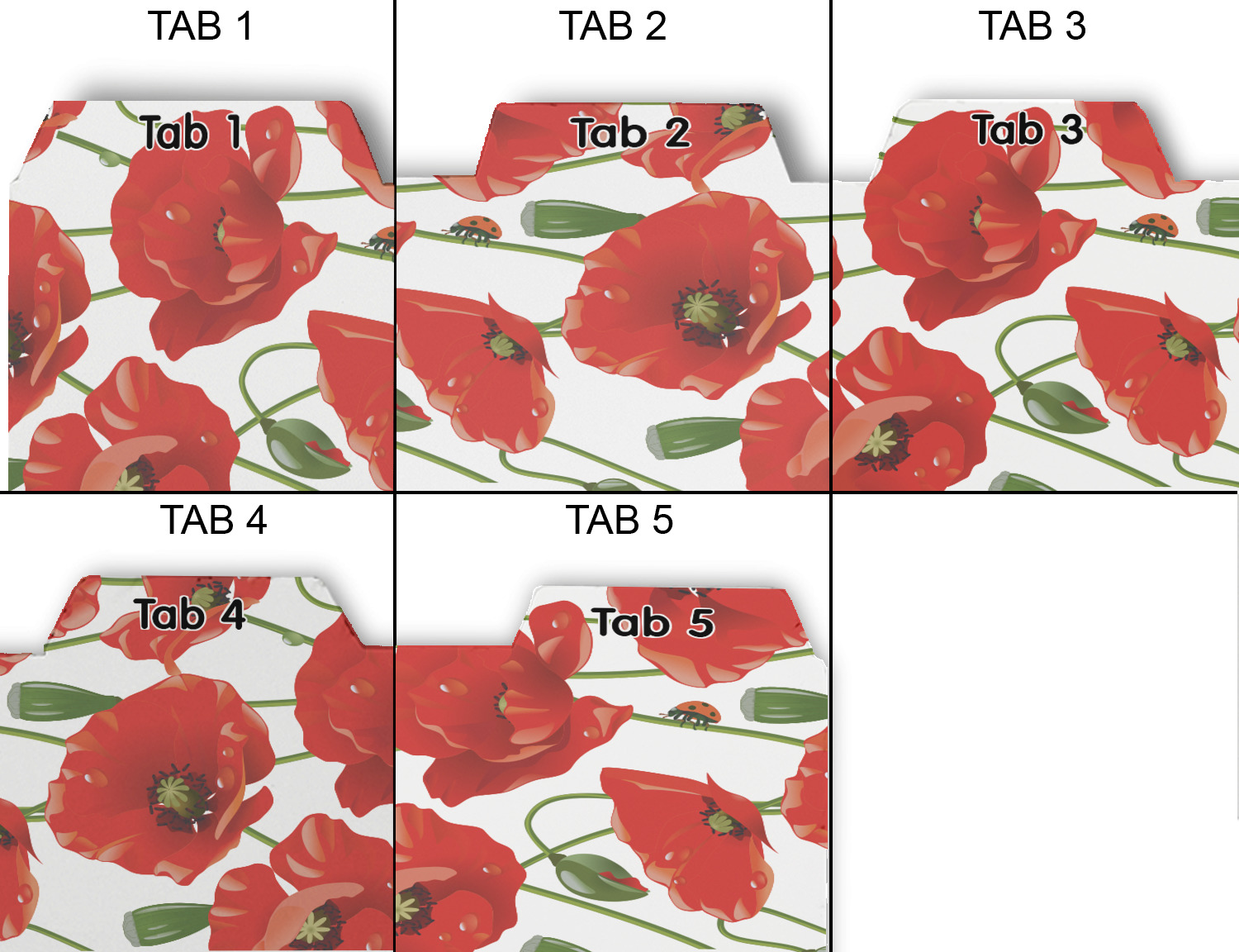 Whether you use binders at school or at work, we have designs to suit all of them. Available in 5 or 6 tab sets, you are sure to find a set to suit your needs. The back of each one is white and can be used to take notes, write vital information on, etc.