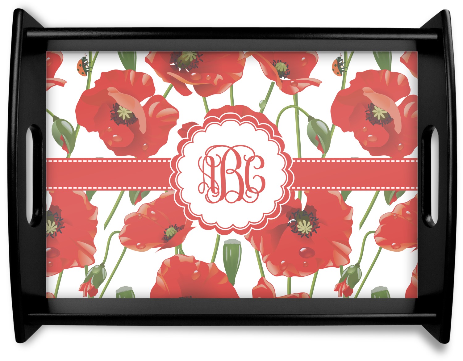 This serving tray with handles features square edges and two rounded sides, creating a very modern look. Each side is fabricated from a beautifully cut, natural wood. The bottom of the interior of the tray displays your customized design in bright, vibrant color. The tray is sold in both a black color and a natural wood look. Each variation of the wood serving tray has two sizes: Small, which is 14" x 10" x 2.25", and Large, which is 19.5" x 13.5" x 2.75".