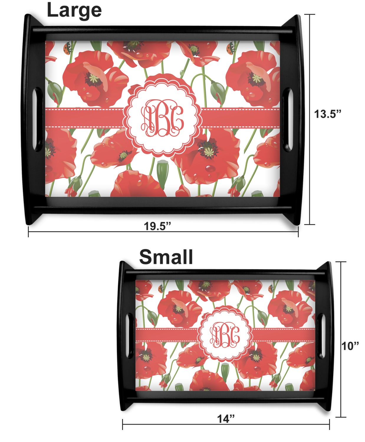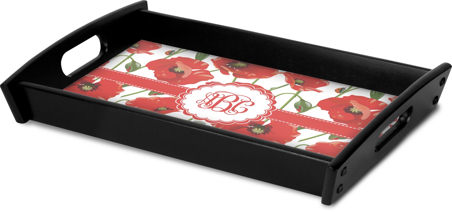 This serving tray with handles features square edges and two rounded sides, creating a very modern look. Each side is fabricated from a beautifully cut, natural wood. The bottom of the interior of the tray displays your customized design in bright, vibrant color. The tray is sold in both a black color and a natural wood look. Each variation of the wood serving tray has two sizes: Small, which is 14" x 10" x 2.25", and Large, which is 19.5" x 13.5" x 2.75".