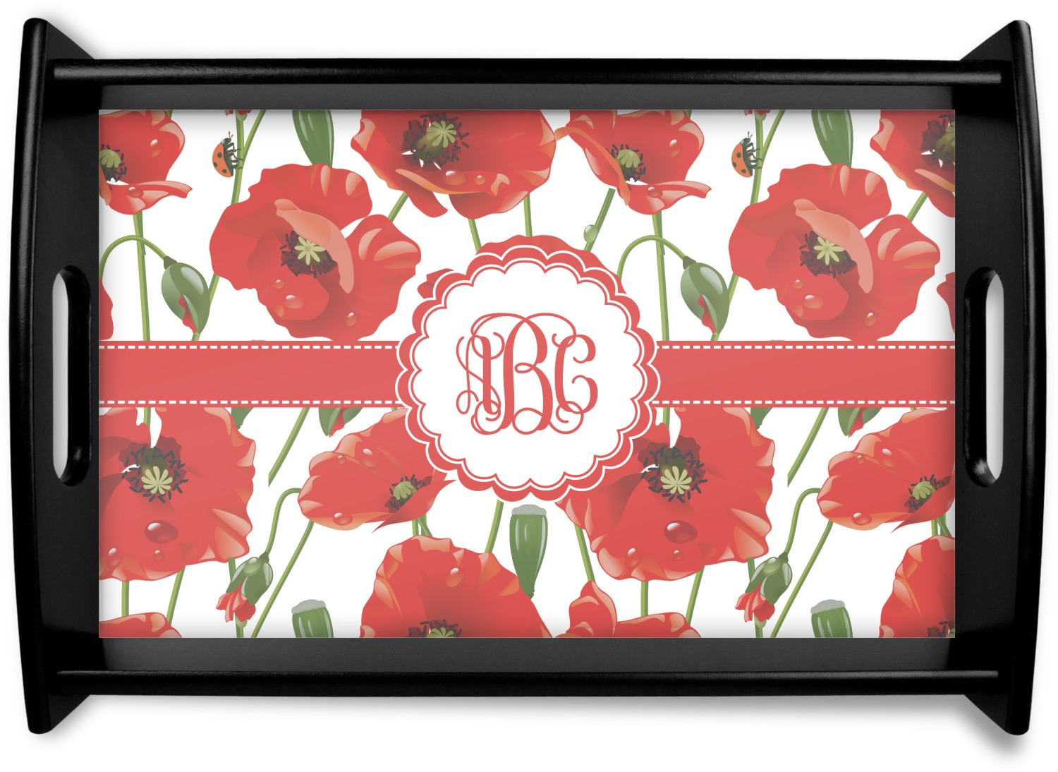 A scalloped label rests in the center of the poppy field, the perfect place for the personalization of your choice.