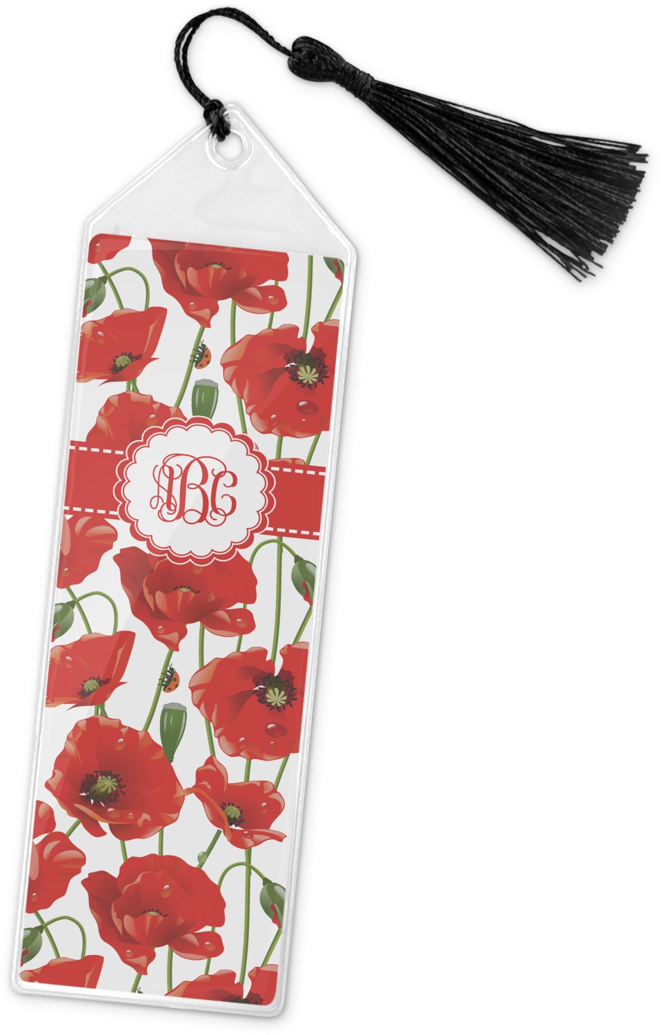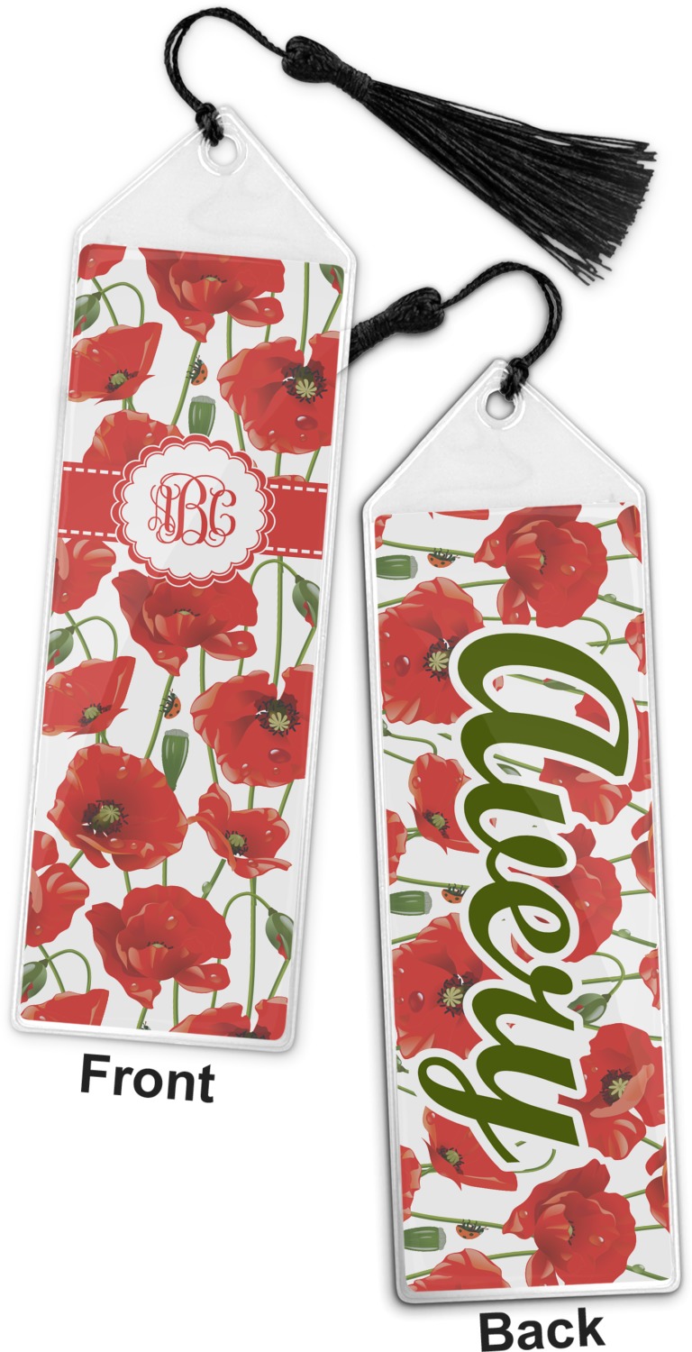 Your personalized bookmark is made of a sturdy, clear vinyl, and is approximately 7.5" x 2.25". We display your personalization on vinyl inserts that are placed on both sides. Accompanying each book marker is a black, fringe tassel that attaches to the reinforced, triangular header.