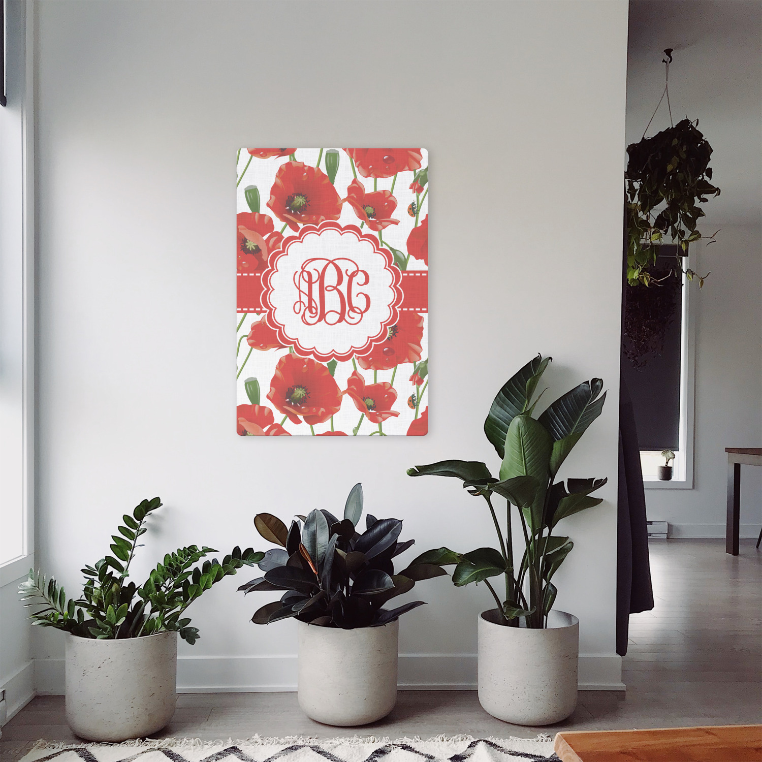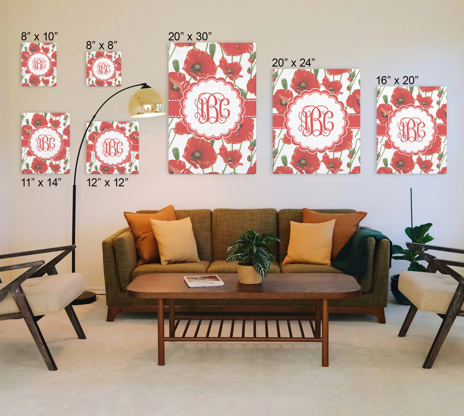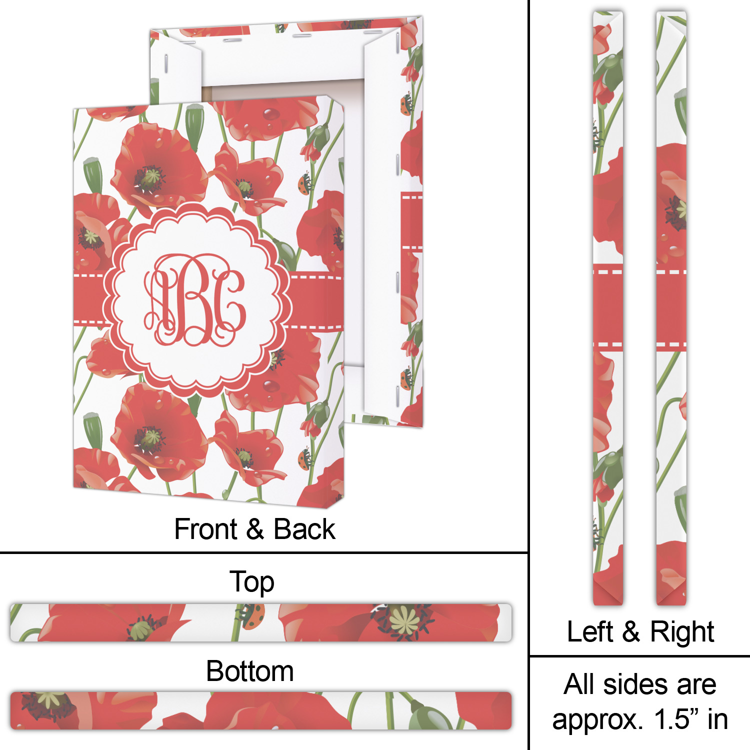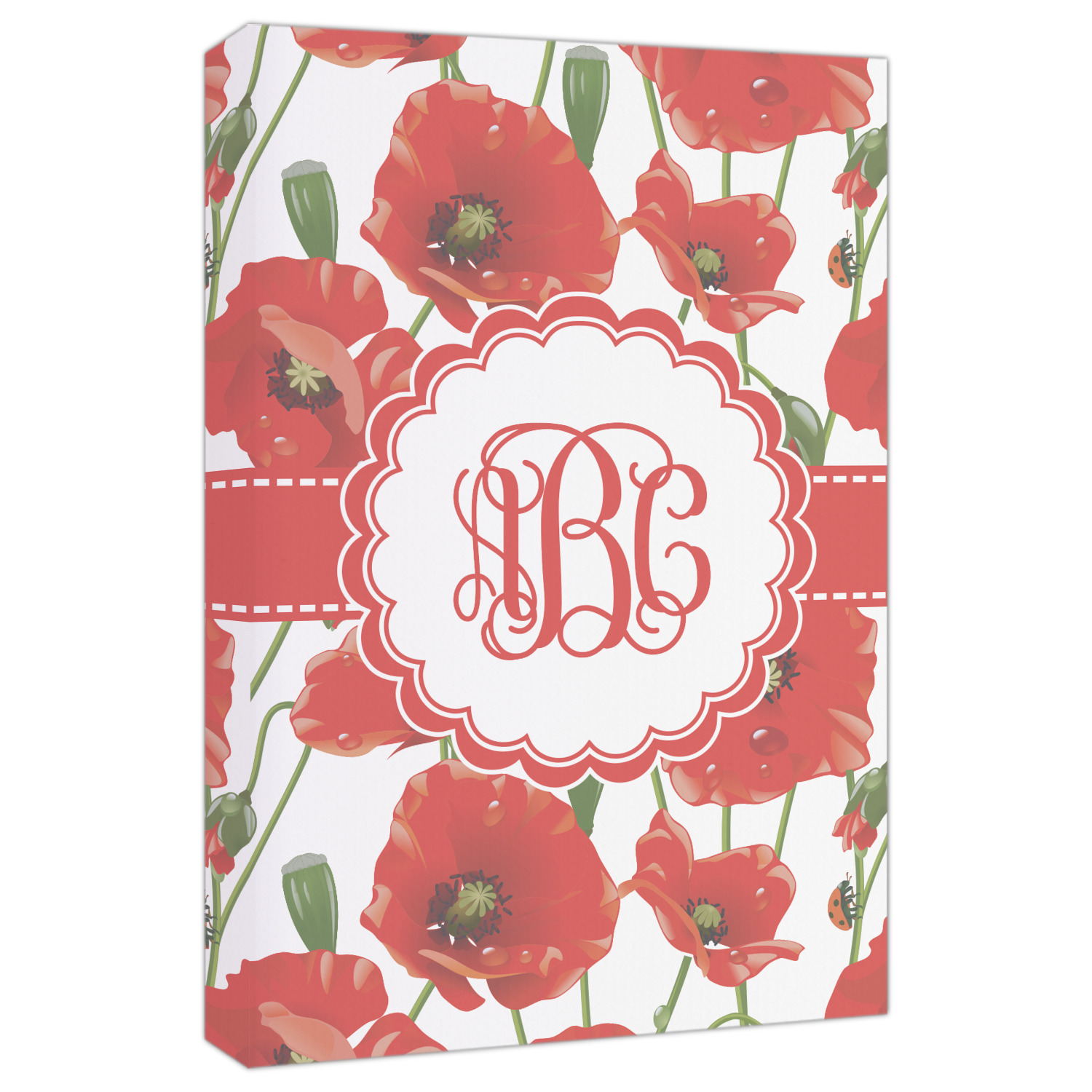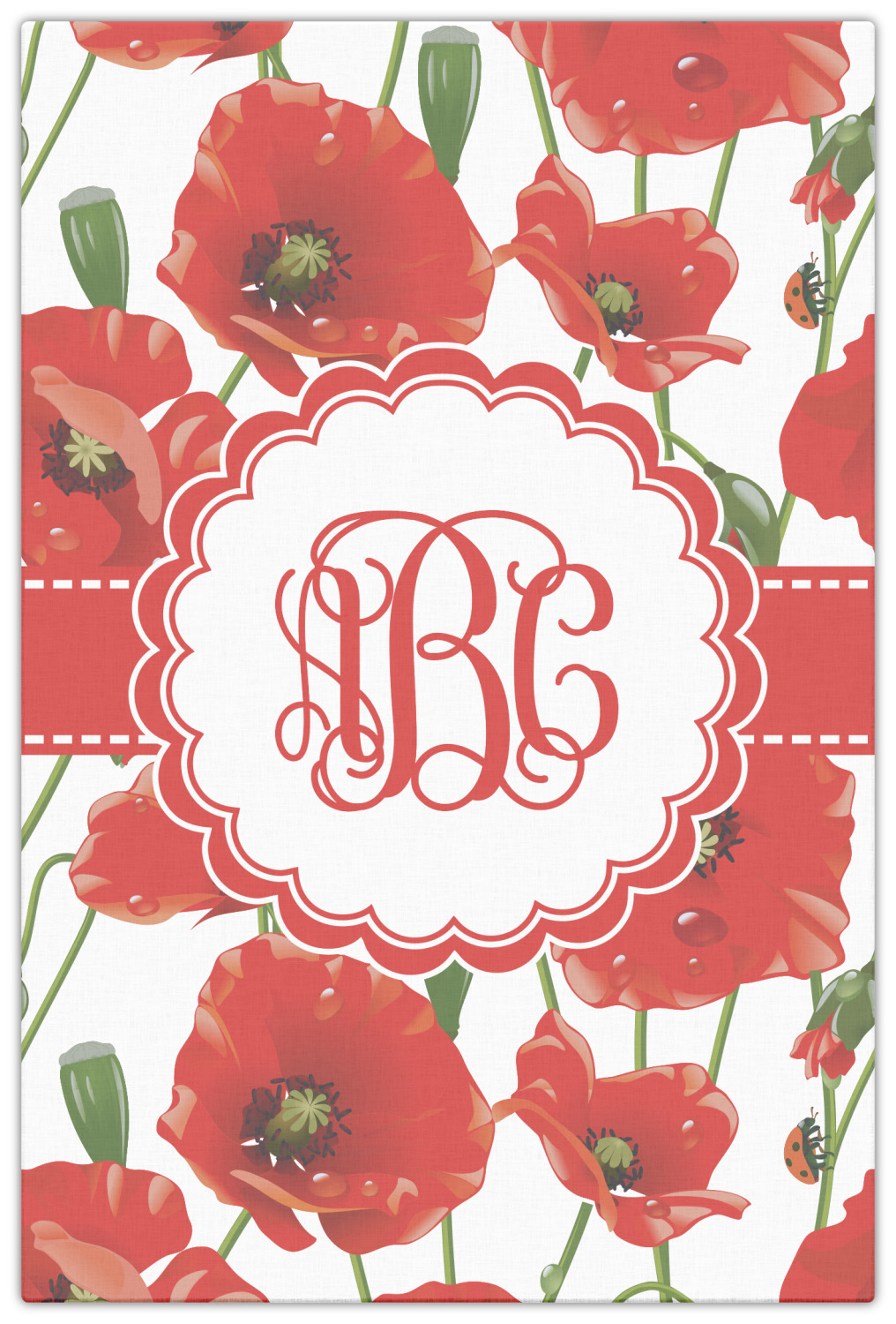 A scalloped label rests in the center of the poppy field, the perfect place for the personalization of your choice.