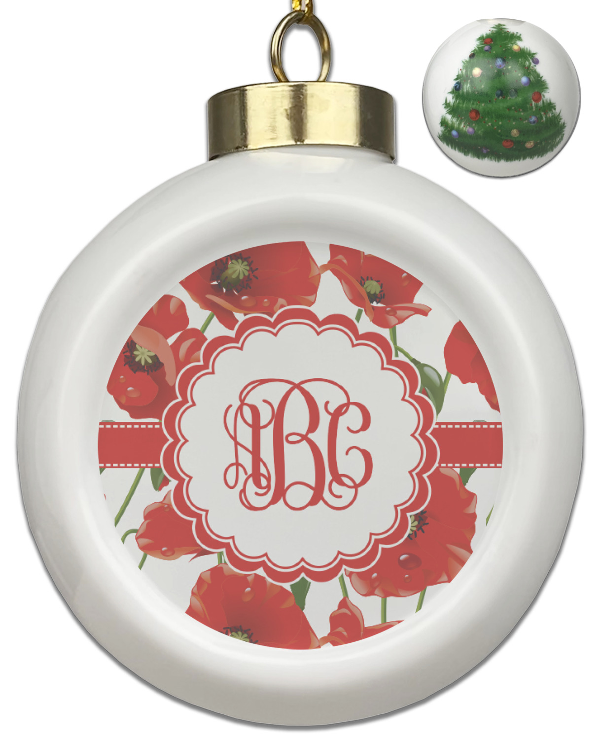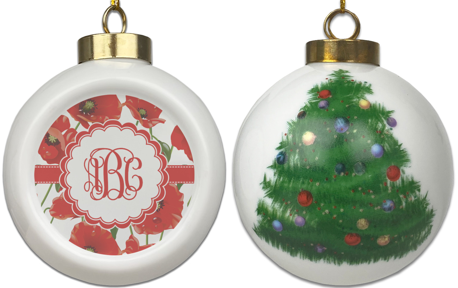 Our Christmas ornaments are a unique ceramic ball shape with a twist as it has a flat face to display your custom design! Select from one of our two design types - Christmas Tree or Poinsettia Garland - to adorn the curved back of your personal design. Each ornament measures 3H x 2.5W x 2D accompanied with a gold string accent for finishing touches to hang on your beautiful Christmas tree!