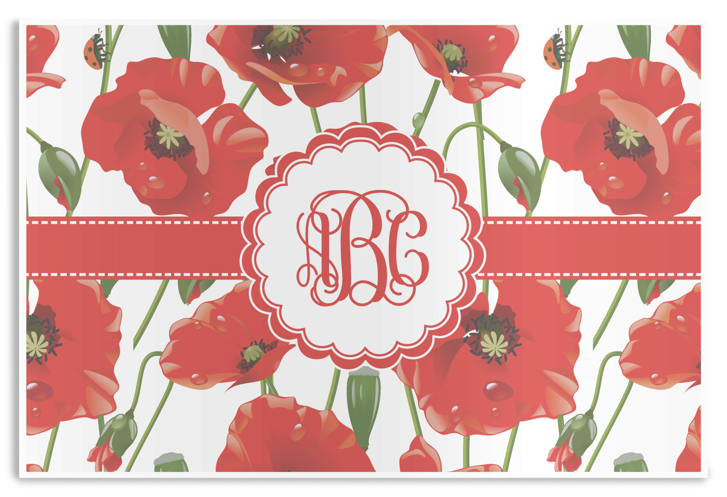 A scalloped label rests in the center of the poppy field, the perfect place for the personalization of your choice.
