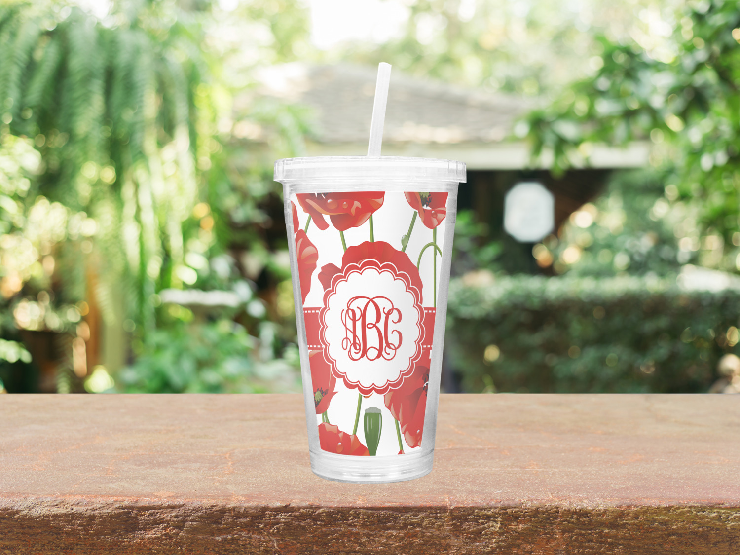 These BPA free tumblers with their double walls keep your drink cold and will not sweat on the outside; they have a clear acrylic top and a reusable straw with a ring around the bottom to keep the straw from falling out.
