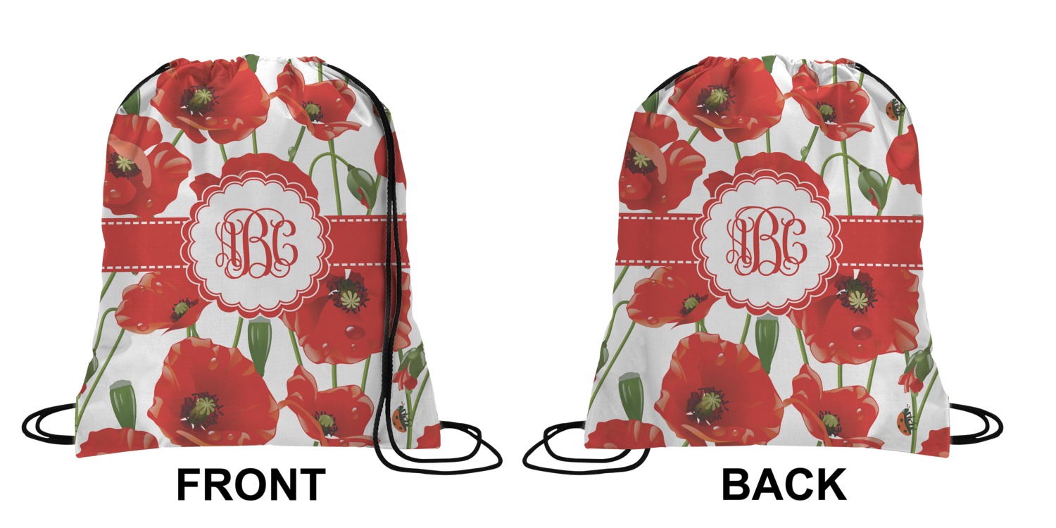 Your custom design will appear on the front and the back of the backpack. You can customize each side individually. The inside of the backpack is white and the drawstrings are black. The back pack is made of 100% polyester fabric.