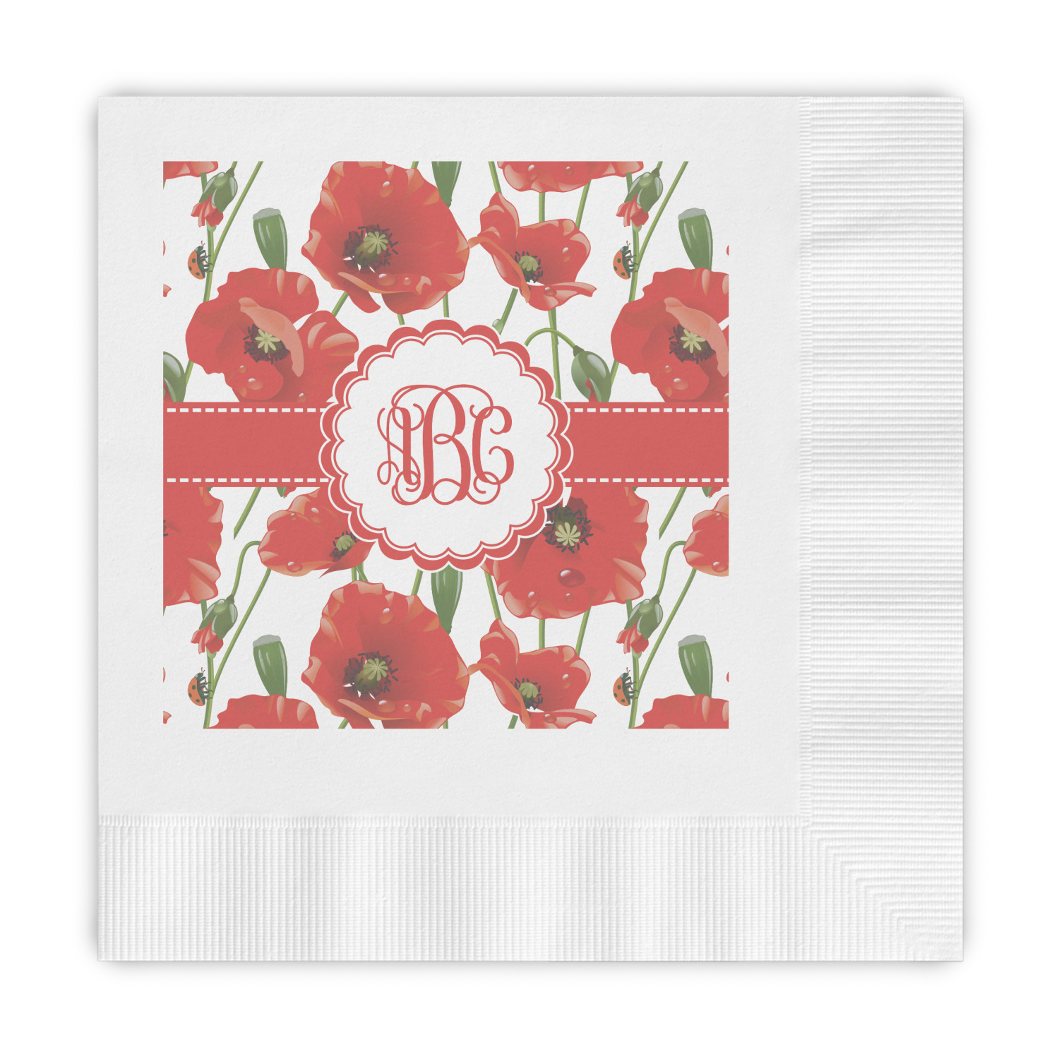 A scalloped label rests in the center of the poppy field, the perfect place for the personalization of your choice.
