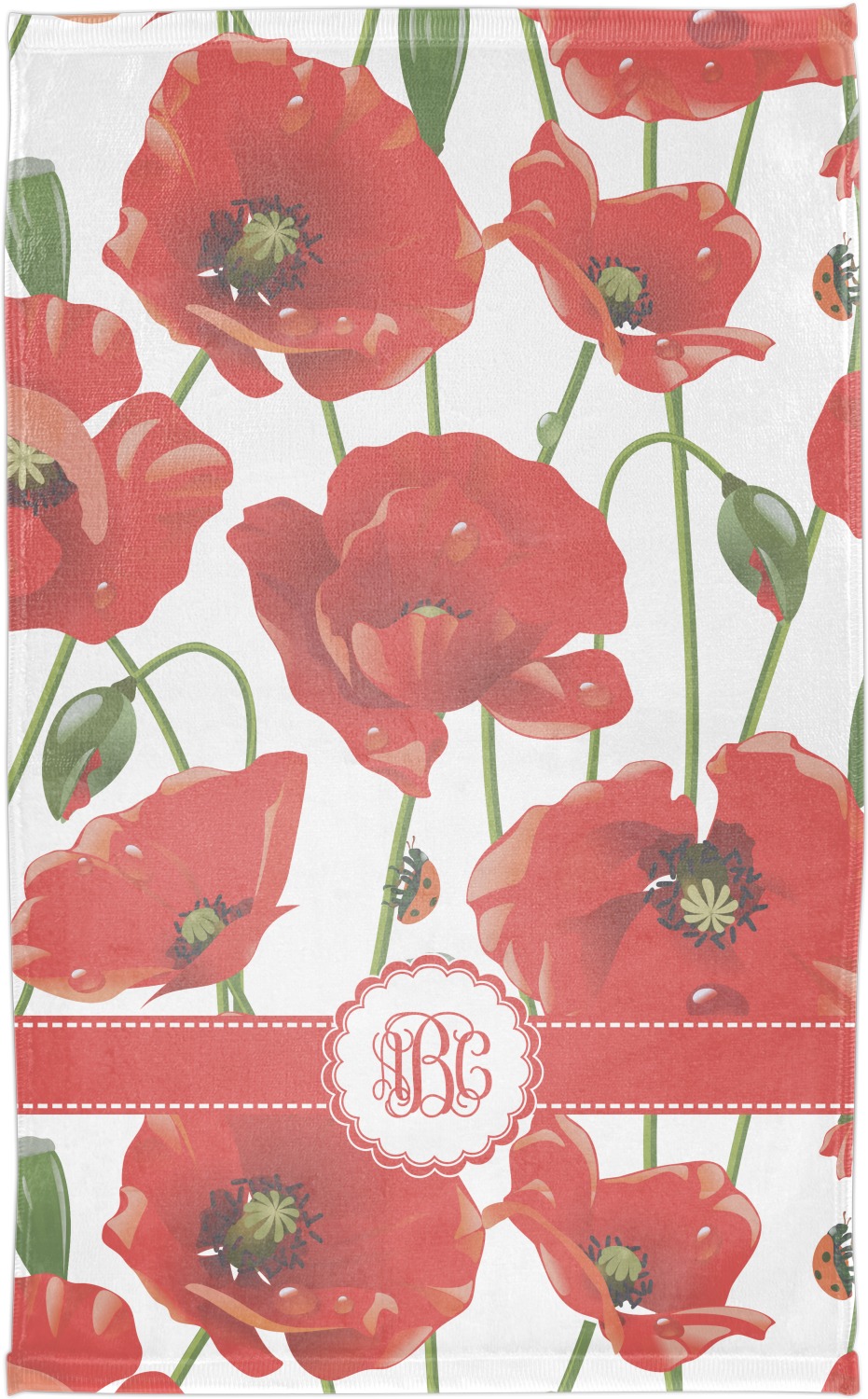 A scalloped label rests in the center of the poppy field, the perfect place for the personalization of your choice.