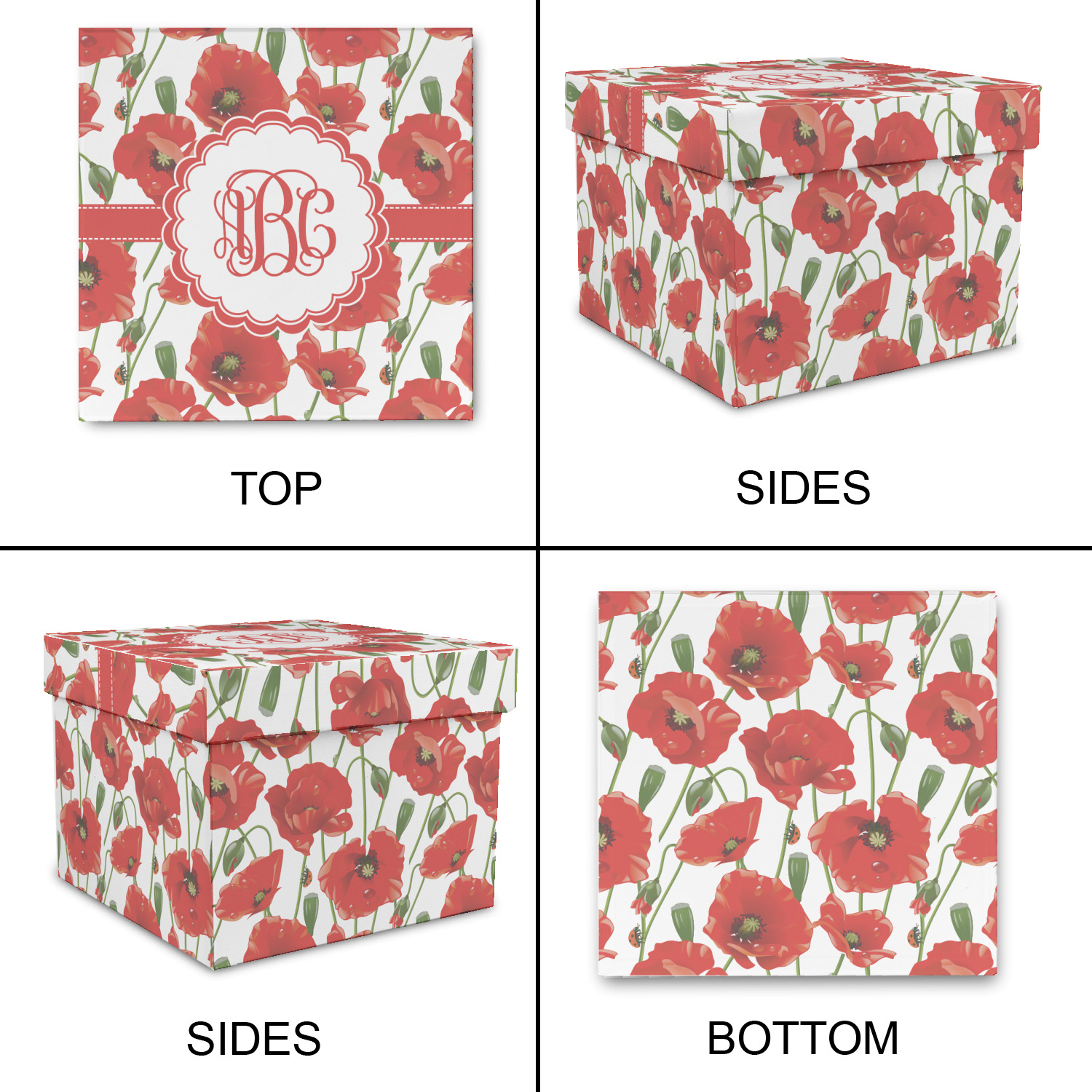 A scalloped label rests in the center of the poppy field, the perfect place for the personalization of your choice.