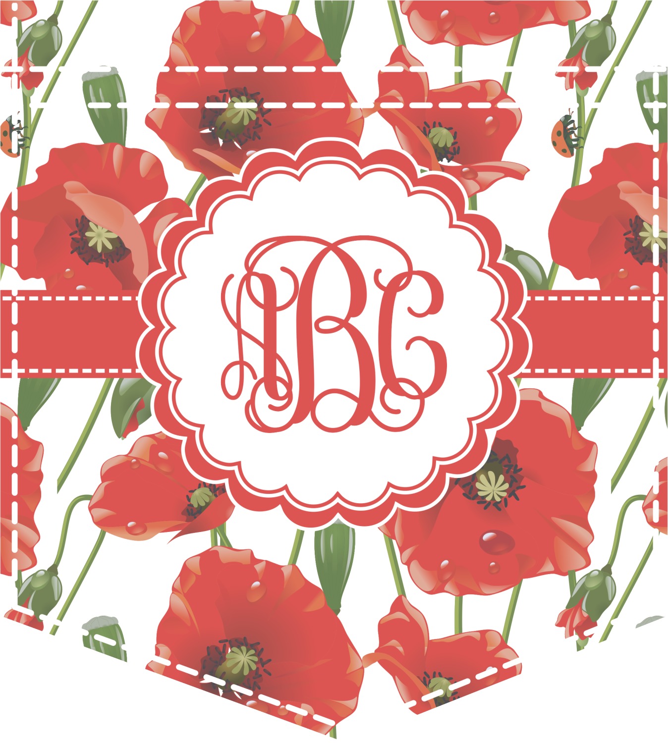 A scalloped label rests in the center of the poppy field, the perfect place for the personalization of your choice.