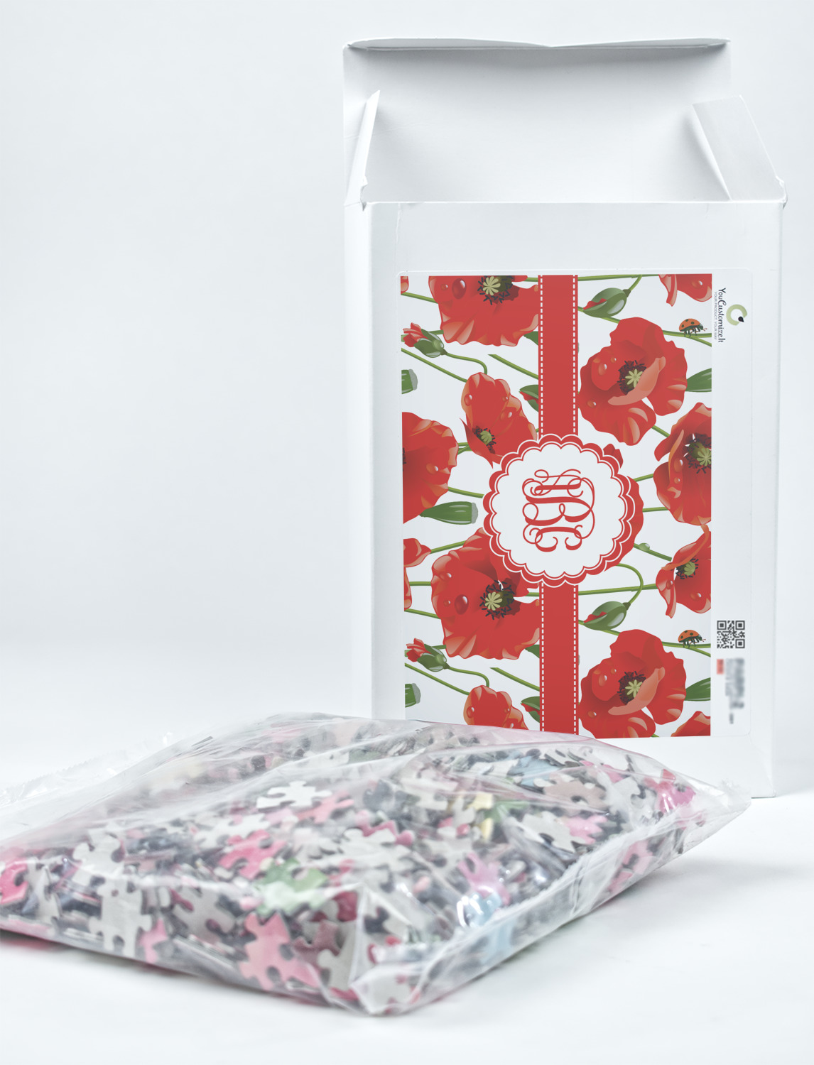 We print our puzzles on thick white chipboard in vibrant colors, then laminate the chipboard and die cut your puzzle. Your jigsaw puzzle is shipped to you in a box with the image of the puzzle on the box.
