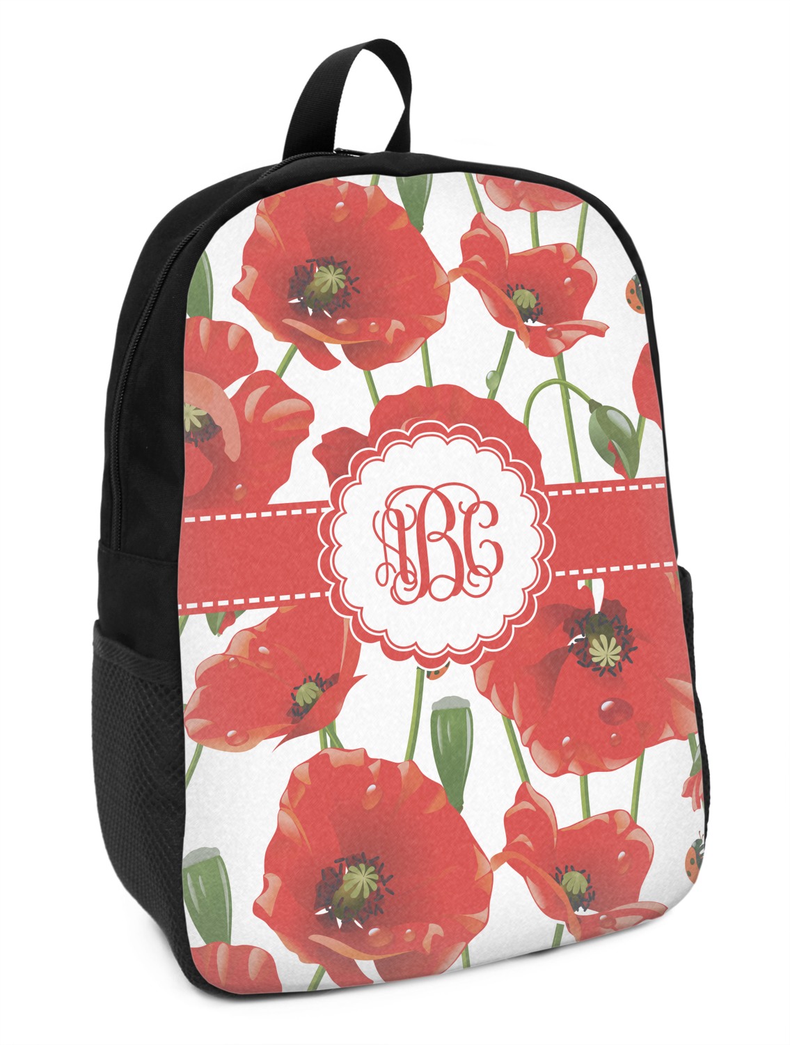 These small backpacks are made of a durable black canvas material with your personalization right on the front. The two shoulder straps are padded and easily adjustable. The bag itself measures at about 11" W x 15" H x 5" D. It's the perfect size for elementary aged kids or adults who want a smaller backpack. On the top of the bag you will find a handle to hang or carry your backpack by as well as a large zipper closure to keep all of your belongings safe inside. On each side of your backpack is a mesh pocket for a small item or water bottle. Inside your backpack you will find a spacious area with a small zipper pocket and a padded laptop slot that will fit up to a 13" laptop (13" being very snug). This is the perfect bag for any student that needs a couple books and their laptop with them at all times. It also works great as a carry on for traveling!