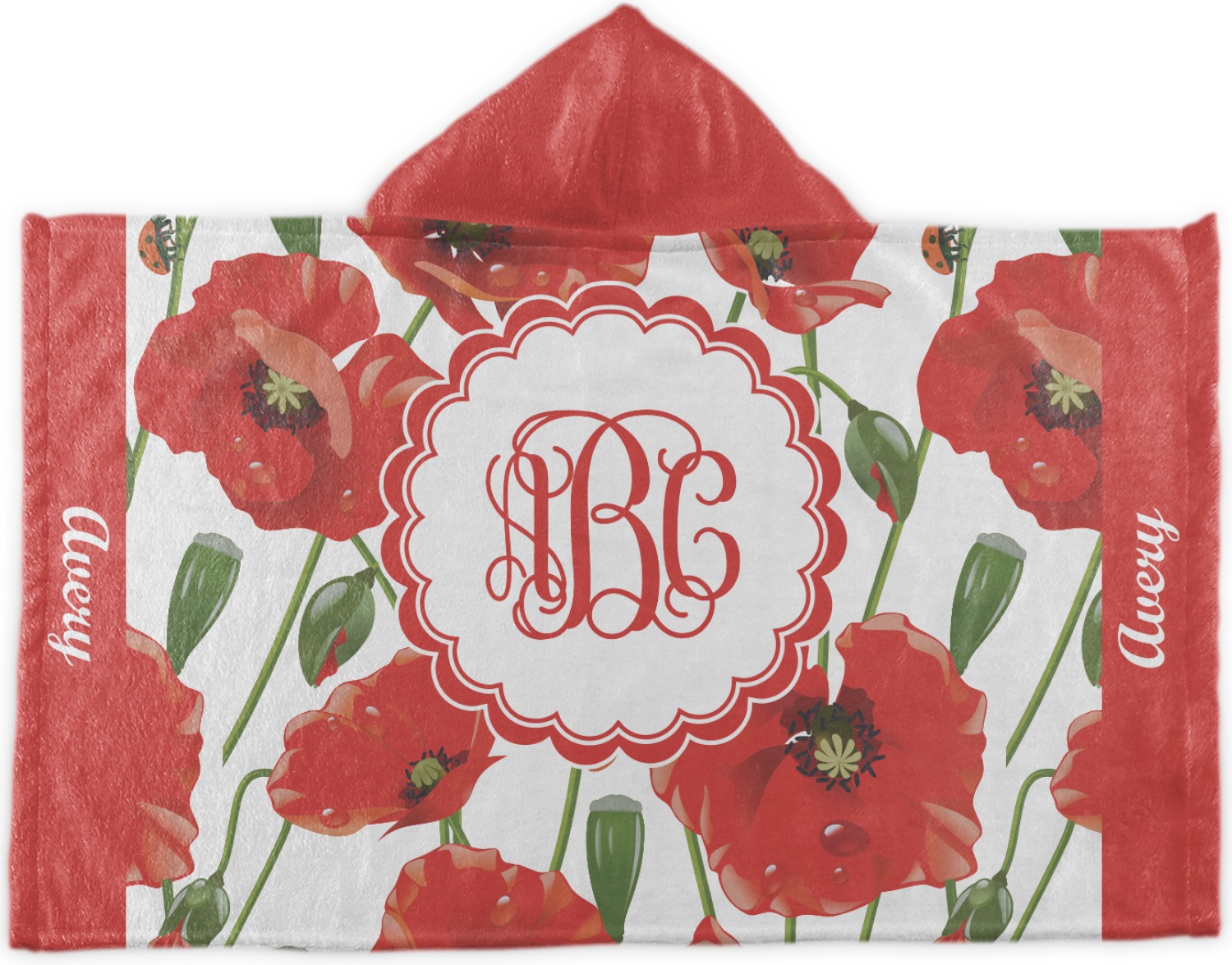A scalloped label rests in the center of the poppy field, the perfect place for the personalization of your choice.