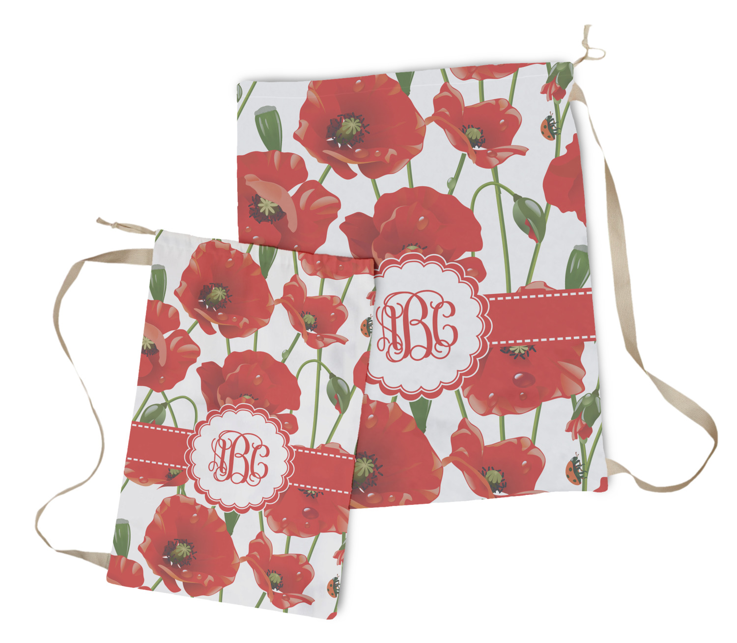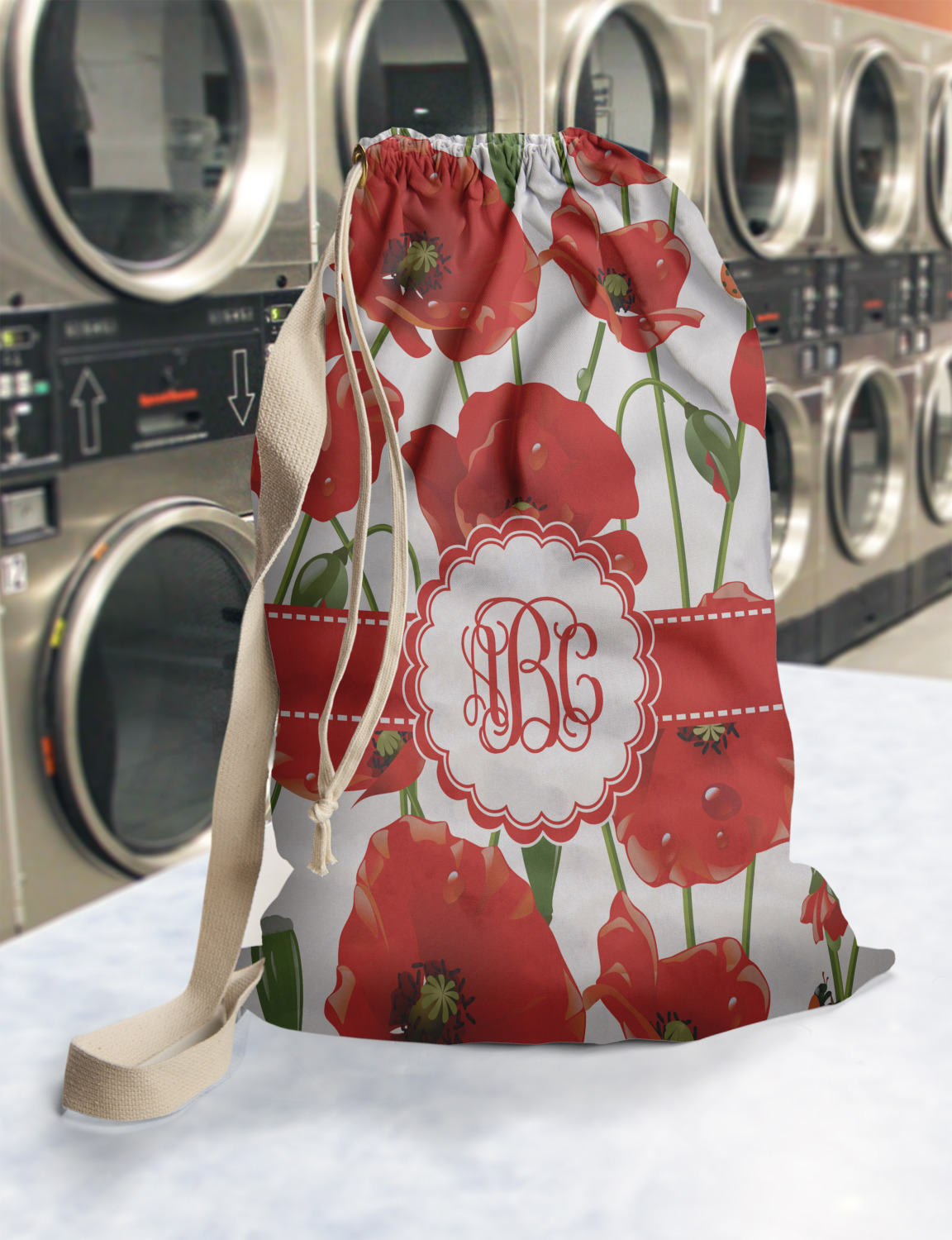 Carry your laundry in style with these customized laundry bags. Available in two sizes, featuring a natural colored woven strap and a cinch cord, these bags hold a lot of clothes or anything else you want to fit in them.
