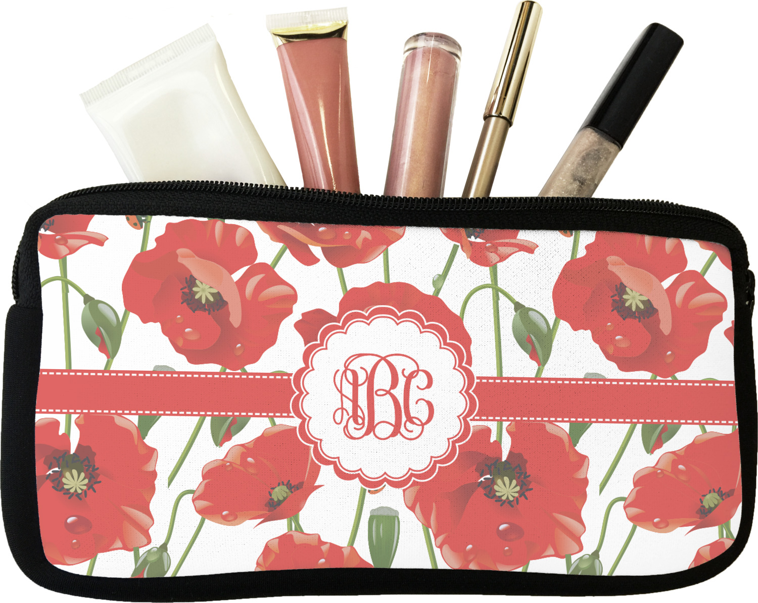 Our personalized makeup bags are available in many different designs, patterns and colors - so you are sure to find one that will love. They are made of neoprene (same material as wet-suits) and thus are water resistant, so spillages in your makeup bag will not end up all over you purse. They are customized on one side and are black on the other side and the zipper is black as well.