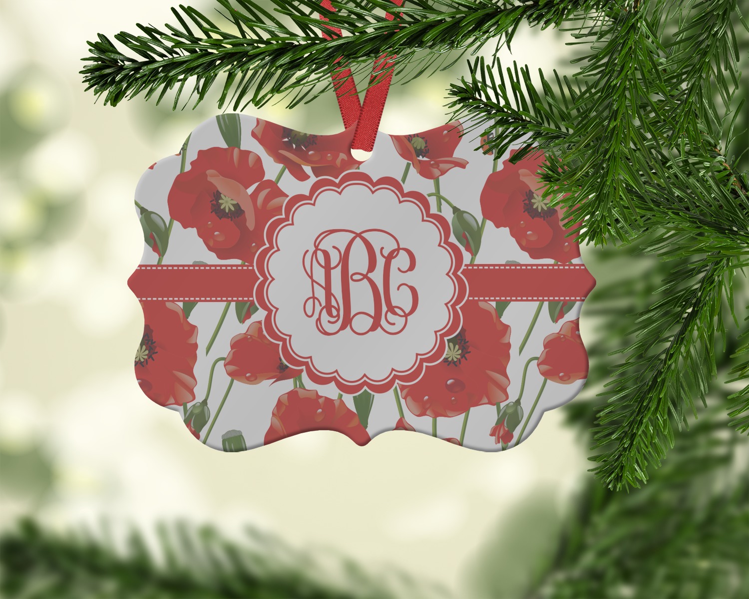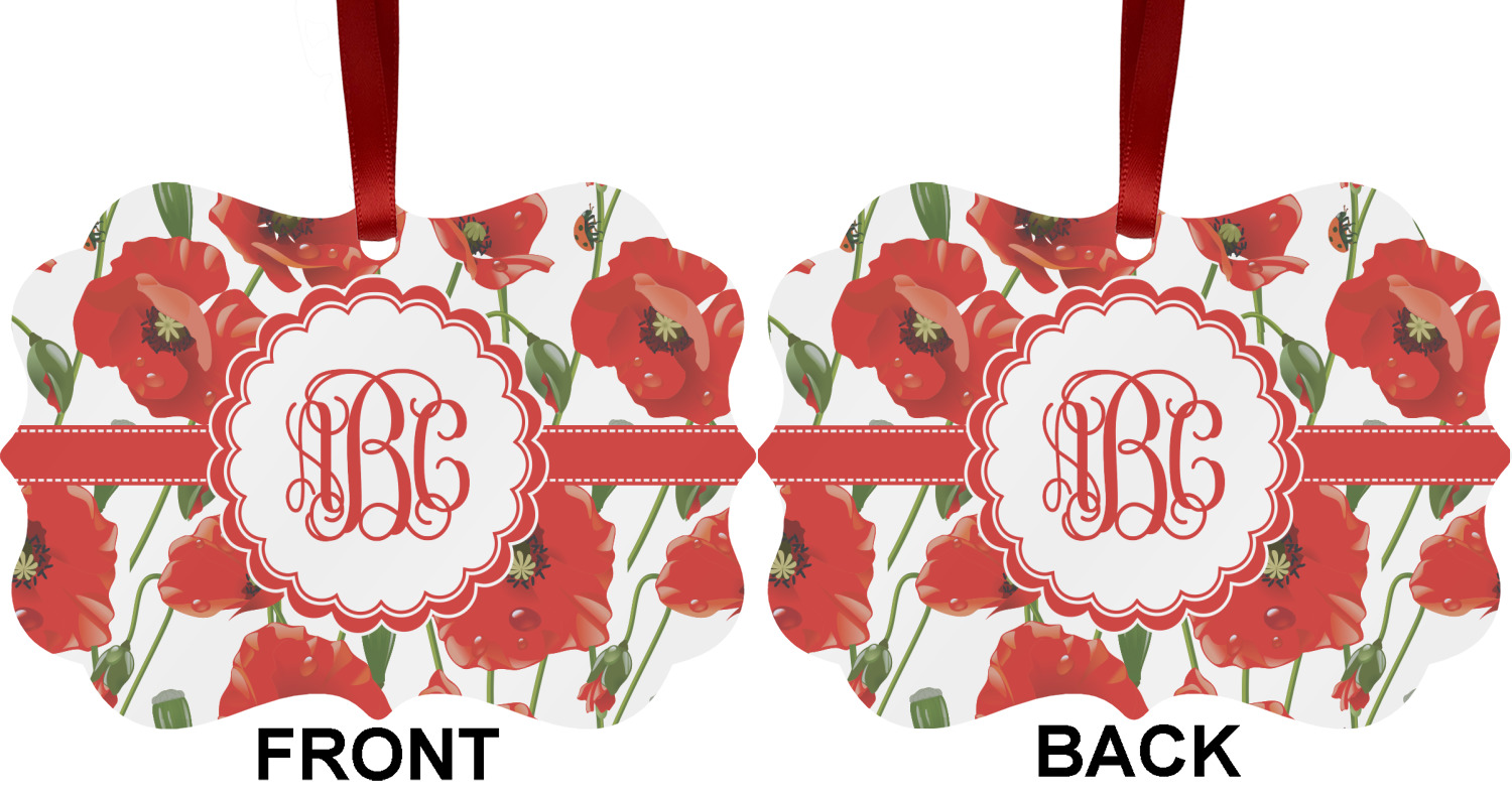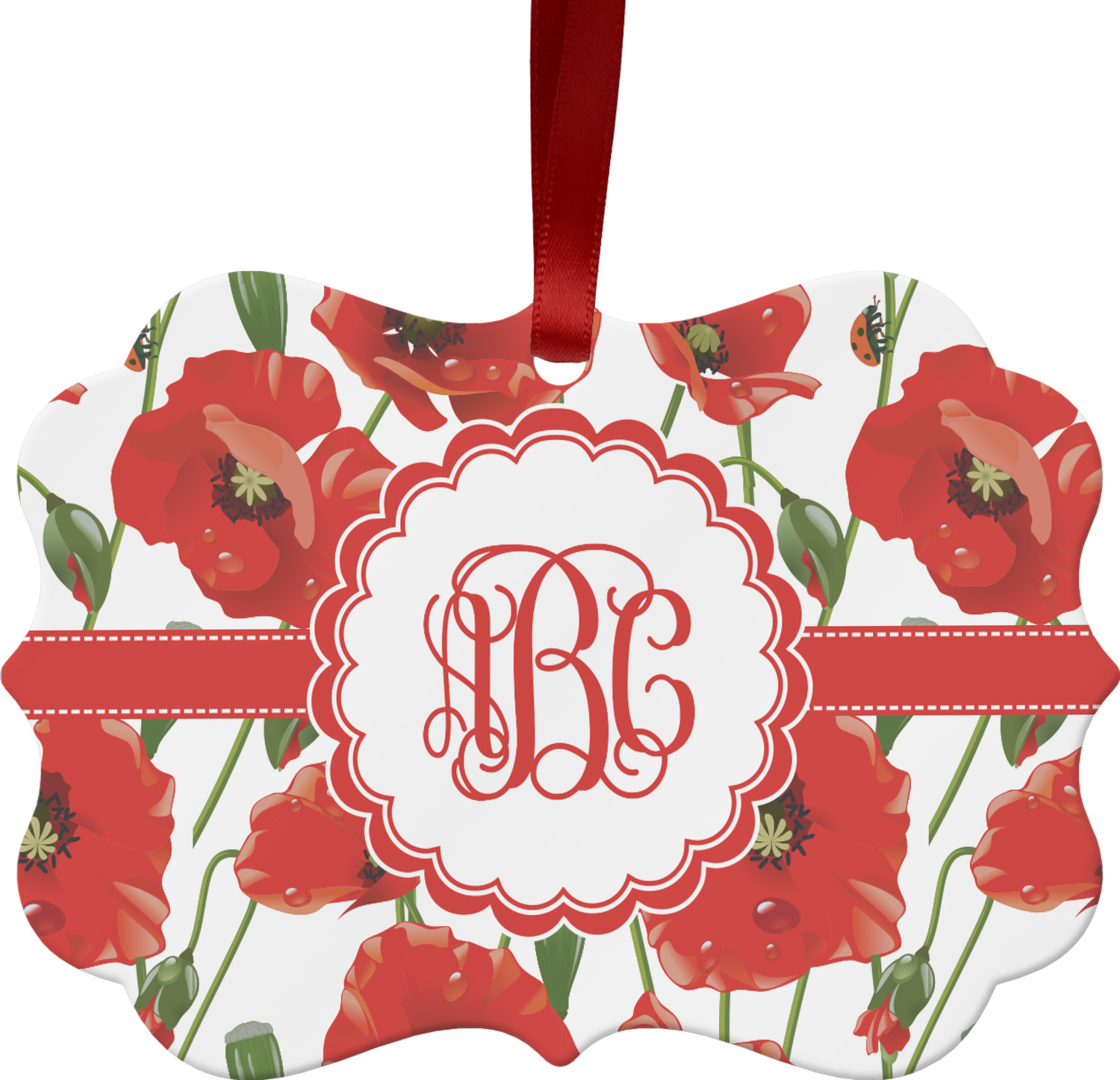 A scalloped label rests in the center of the poppy field, the perfect place for the personalization of your choice.