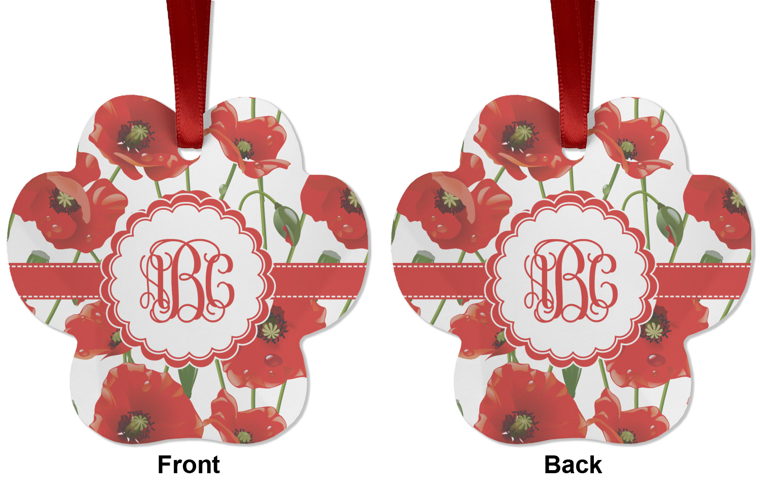 A scalloped label rests in the center of the poppy field, the perfect place for the personalization of your choice.
