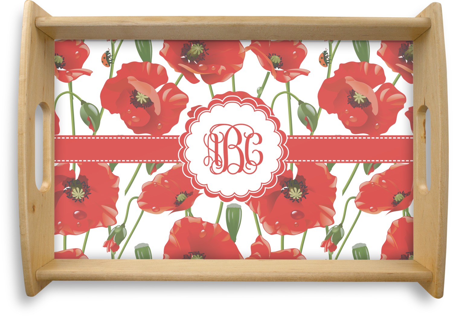 A scalloped label rests in the center of the poppy field, the perfect place for the personalization of your choice.