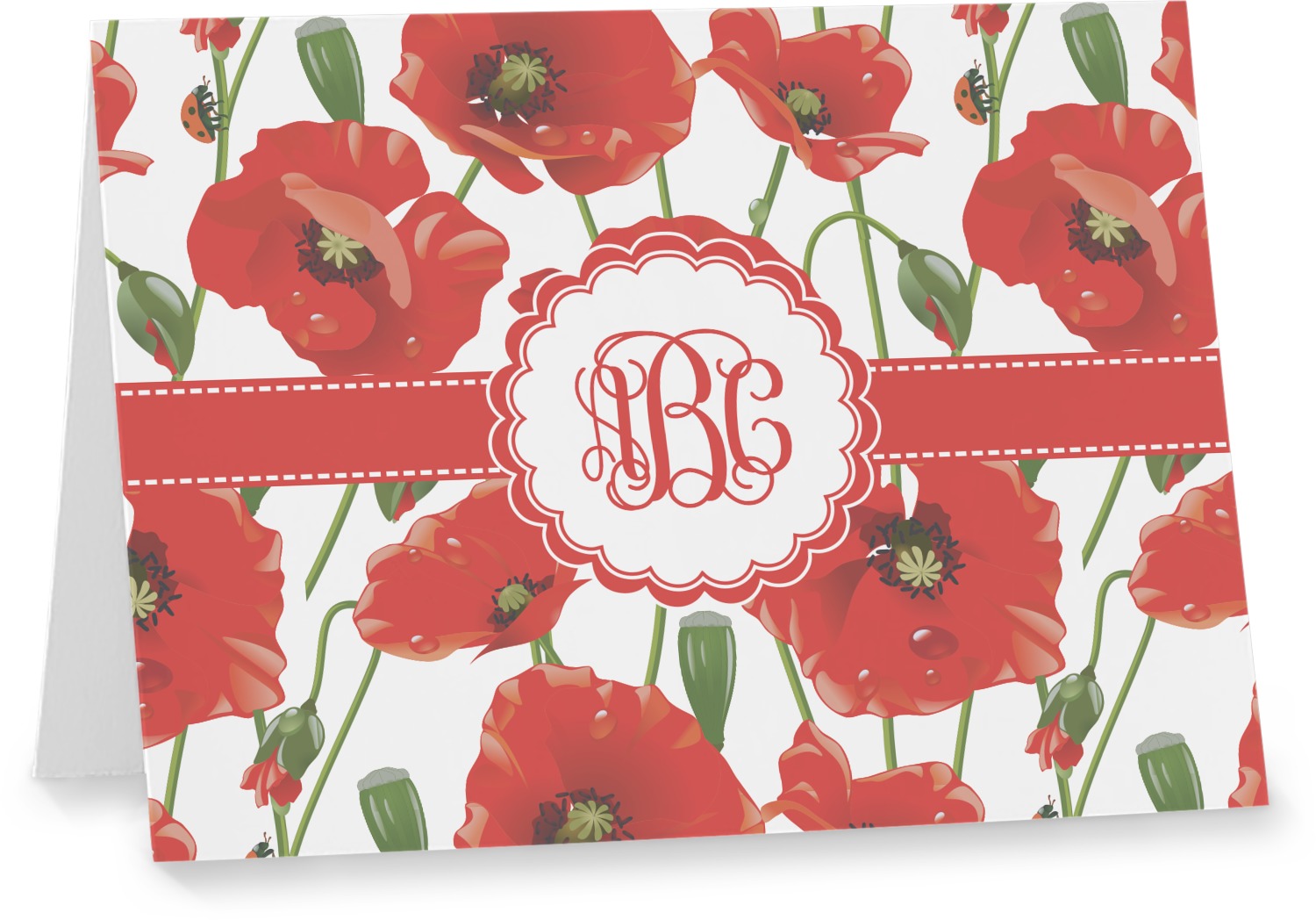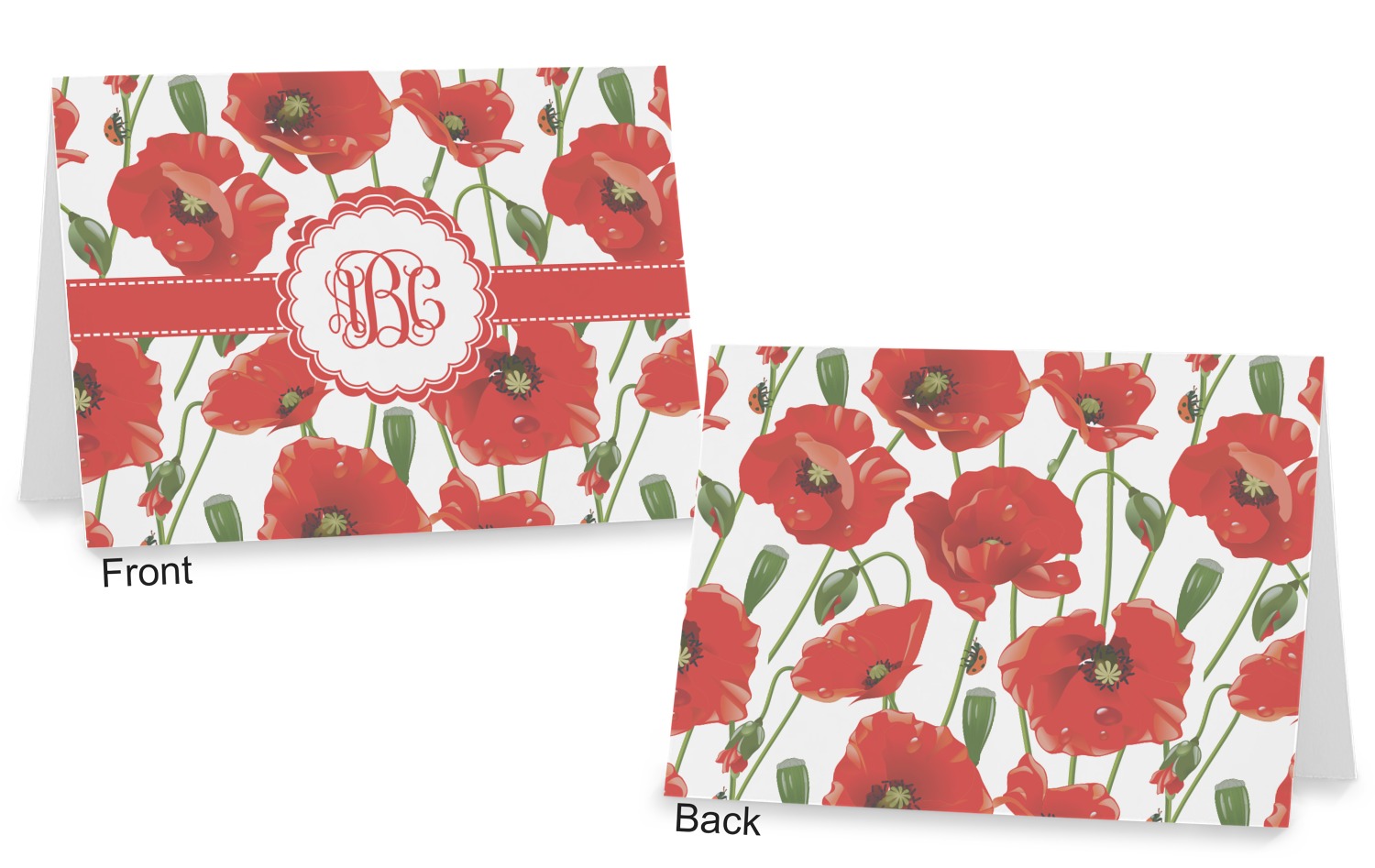 A scalloped label rests in the center of the poppy field, the perfect place for the personalization of your choice.