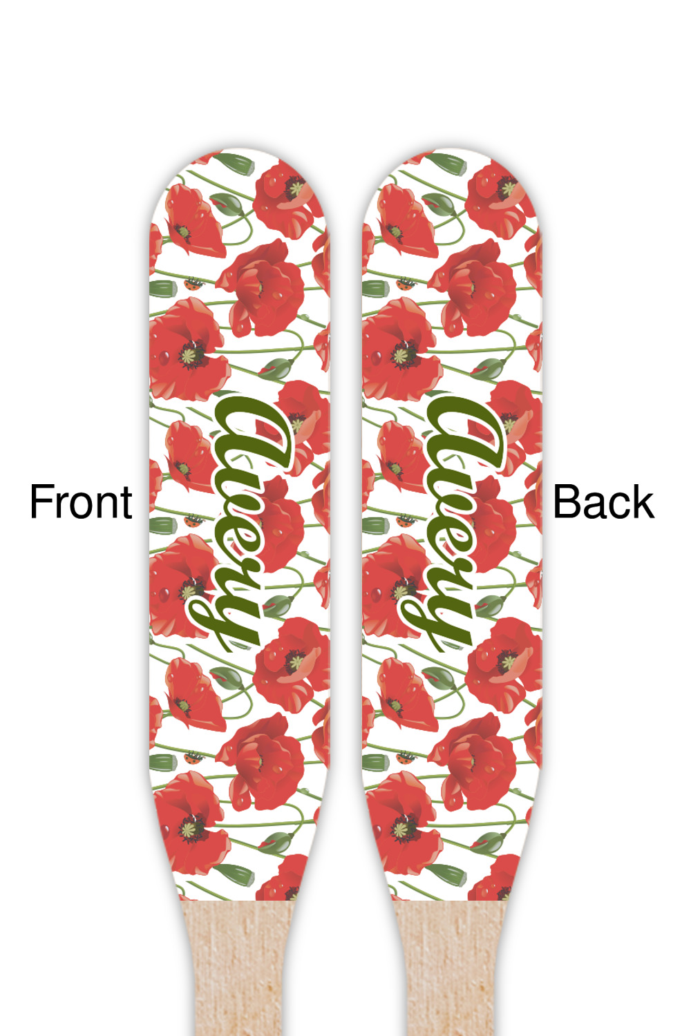 A scalloped label rests in the center of the poppy field, the perfect place for the personalization of your choice.