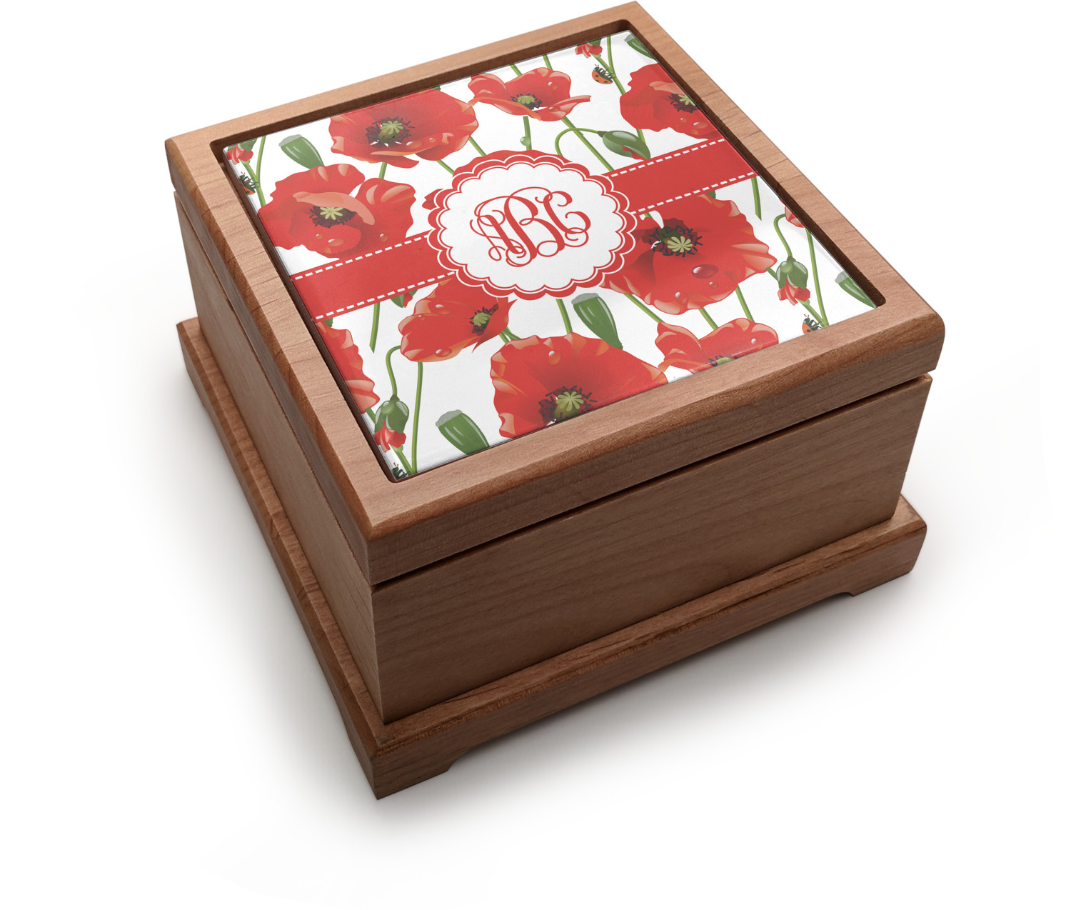 A scalloped label rests in the center of the poppy field, the perfect place for the personalization of your choice.
