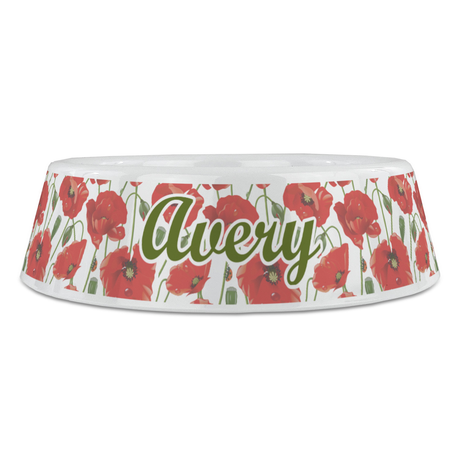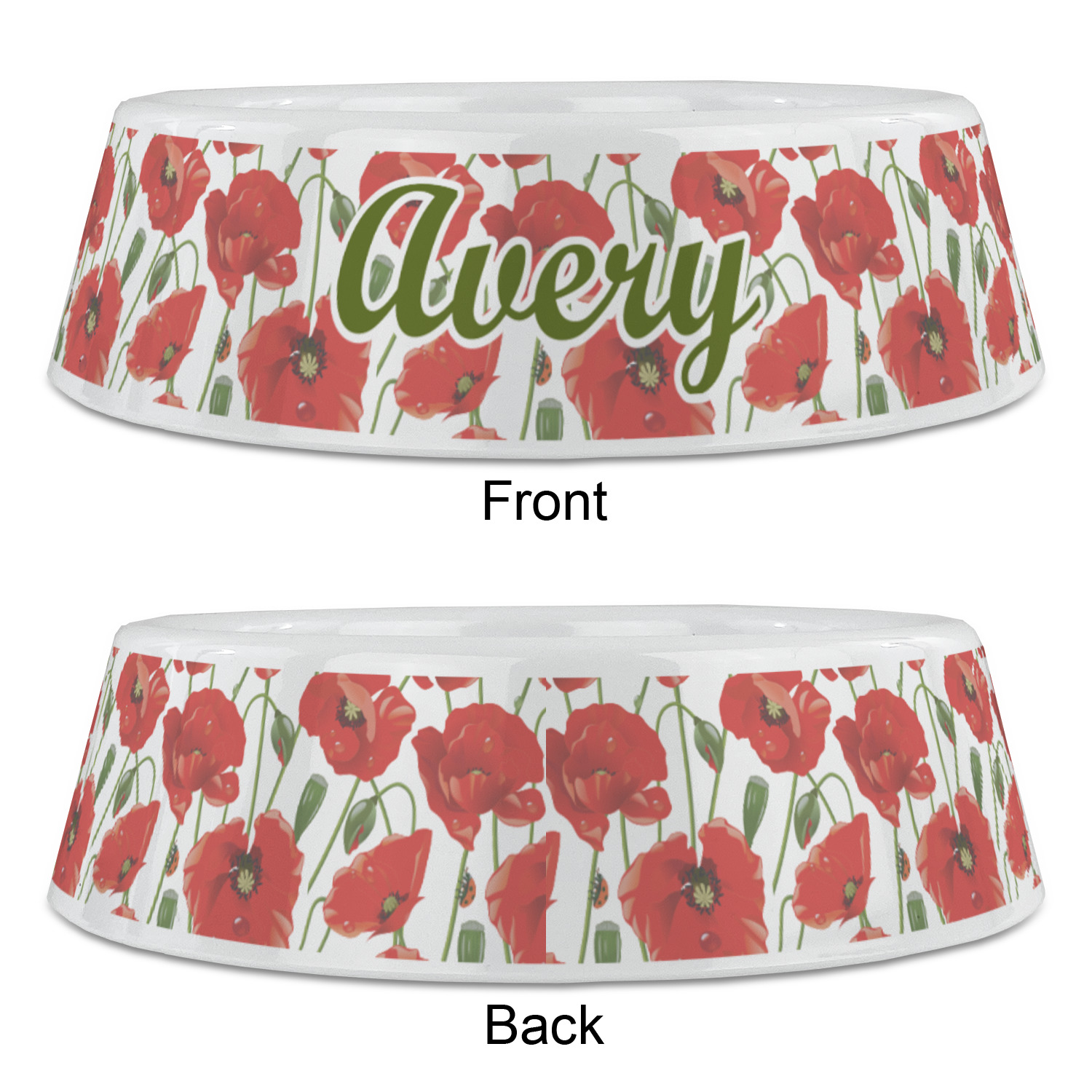 A scalloped label rests in the center of the poppy field, the perfect place for the personalization of your choice.