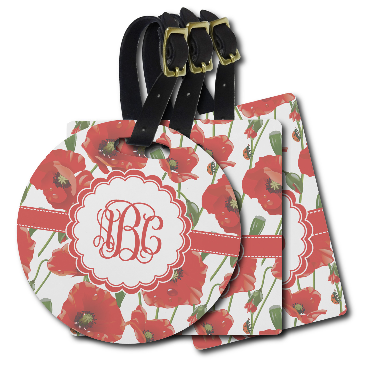 These personalized bag tags are sold in a variety of shapes, so that you may find the product that meets your vision exactly. We sell a round luggage tag, which measures at approximately 4" x 4". Our square luggage tag is about 3.5" x 3.5", while our rectangular version is 2.75" x 4 ".