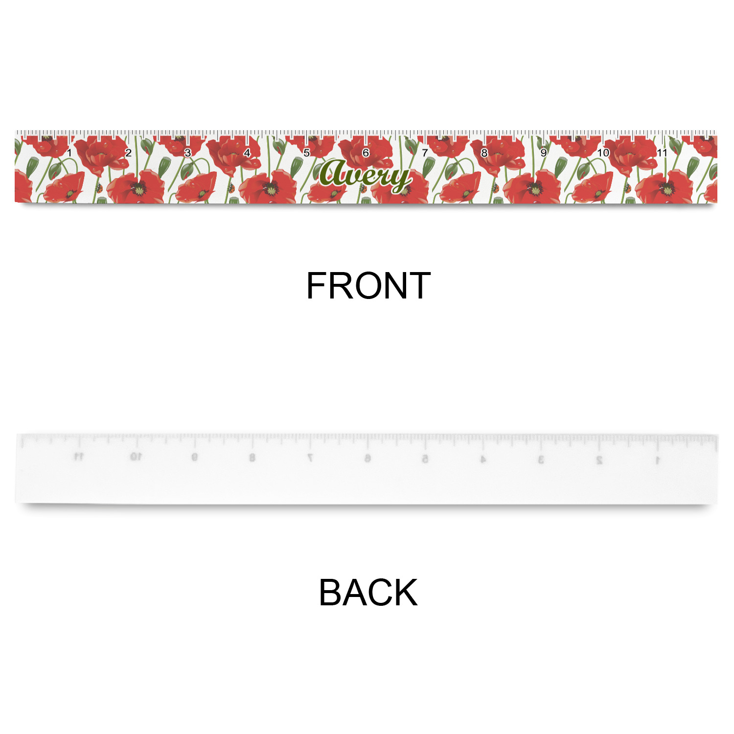 A scalloped label rests in the center of the poppy field, the perfect place for the personalization of your choice.