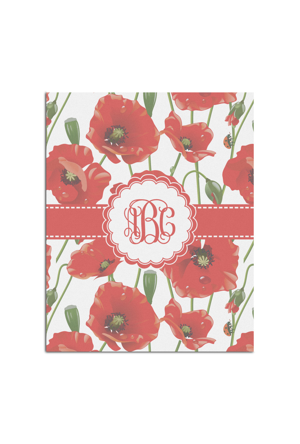 A scalloped label rests in the center of the poppy field, the perfect place for the personalization of your choice.