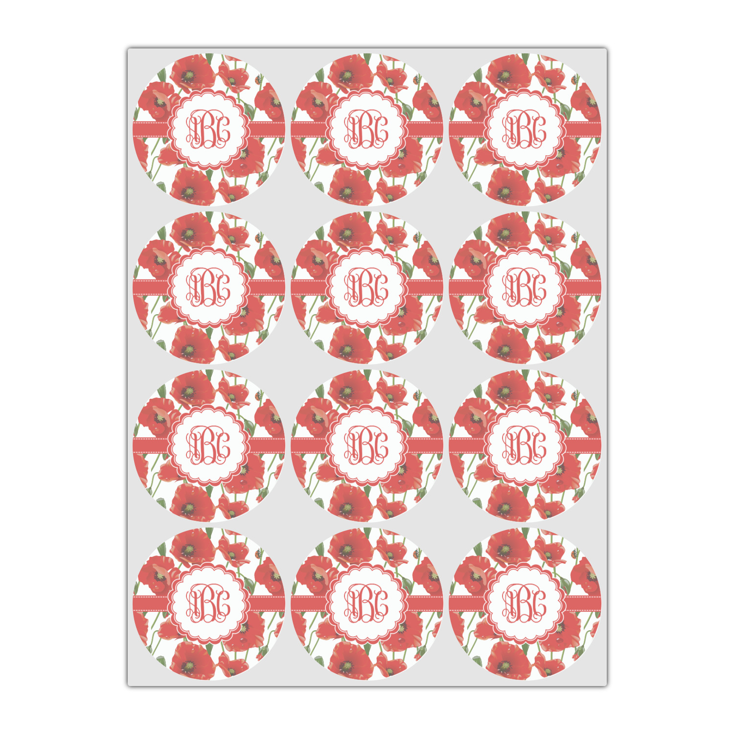 A scalloped label rests in the center of the poppy field, the perfect place for the personalization of your choice.